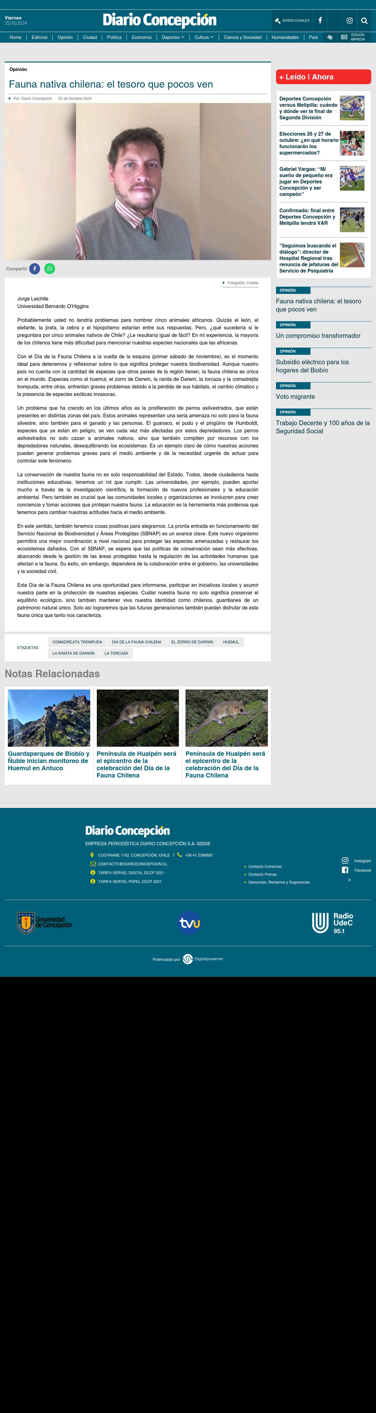 Fauna nativa chilena: el tesoro que pocos ven 25-10-2024 Diario Concepcion Jorge Leichtle Universidad Bernardo OHiggins Probablemente usted no tendría problemas para nombrar cinco animales africanos. Quizás el león, el elefante, la jirafa, la cebra y el hipopótamo es... |