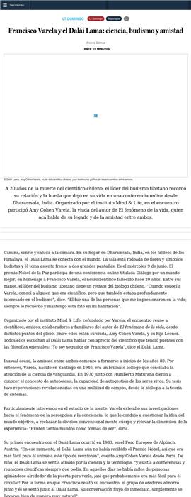 En ese momento brillante, la materia de la que estaba hecha su amistad no era ni el budismo ni la ciencia, sino simplemente el amor”. Era el 23 de mayo de 2001; Varela murió cinco días después. Veinte años más tarde, con el retrato del científico chileno frente a sí, el Dalái Lama revivió su amistad: -Estoy bastante seguro de que nos seguiremos viendo. No sé si él pueda reconocerme, pero seguramente tendremos una conexión mental. Es posible que si vivo 10,20 años más, me encuentre con un niño que me diga algo que me recuerde a Francisco Varela.