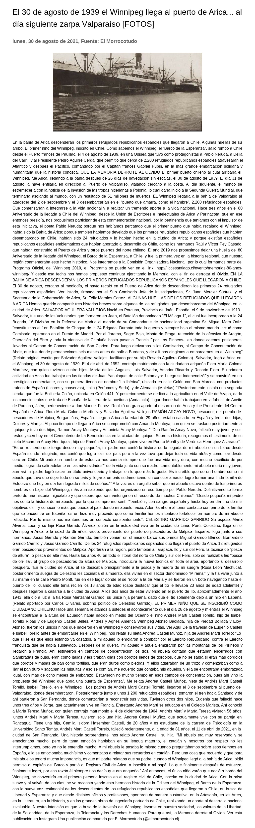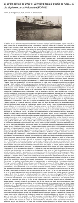 El 30 de agosto de 1939 el Winnipeg llega al puerto de Arica... al día siguiente zarpa Valparaíso [FOTOS] 31-08-2021 El Morrocotudo En la bahía de Arica descenderán los primeros refugiados republicanos españoles que llegaron a Chile. Algunas huellas de su arribo. El primer niño del Winnipeg, inscrito en Chile. Como sabemo... |