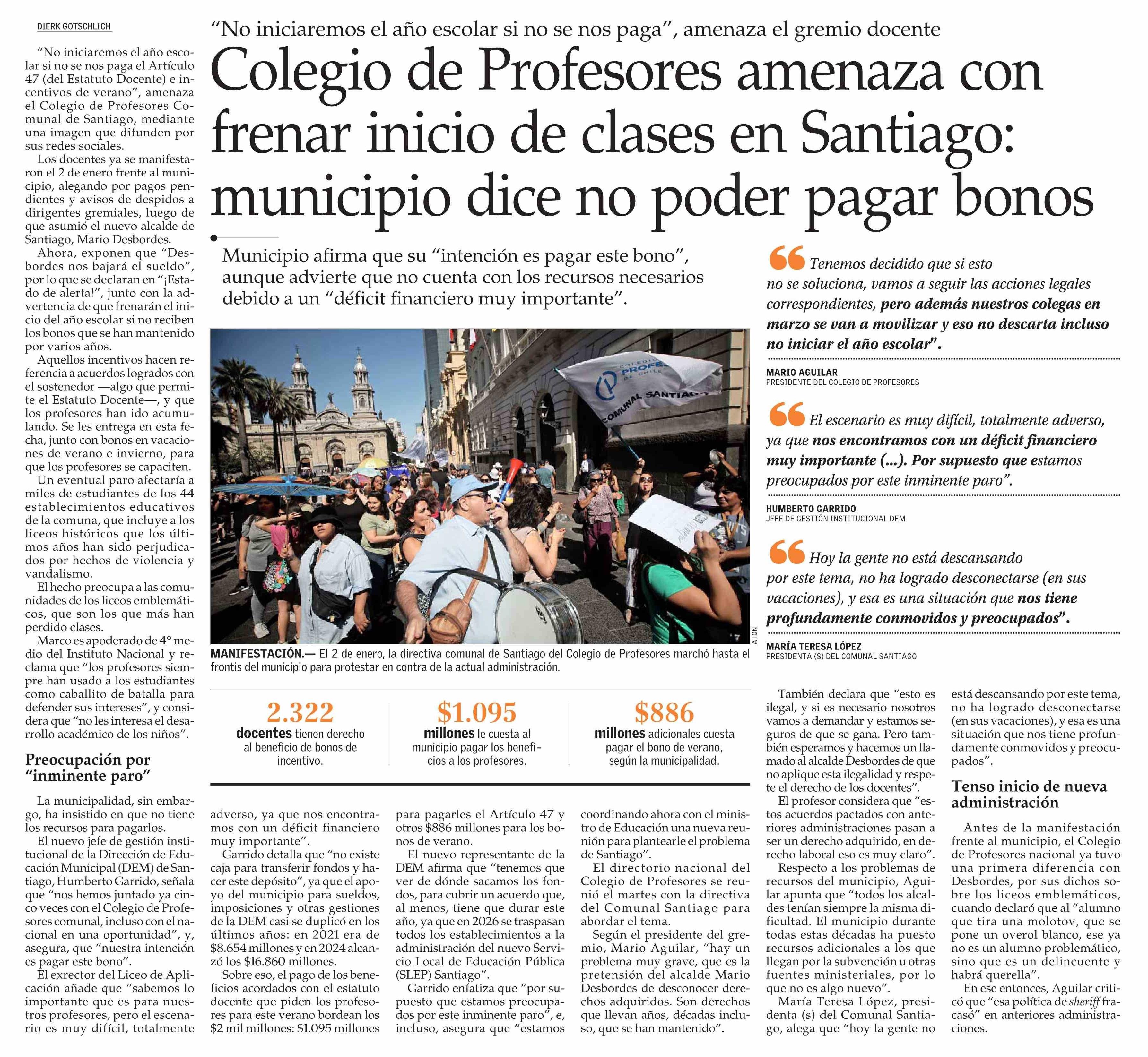 Colegio de Profesores amenaza con frenar inicio de clases en Santiago: municipio dice no poder pagar bonos