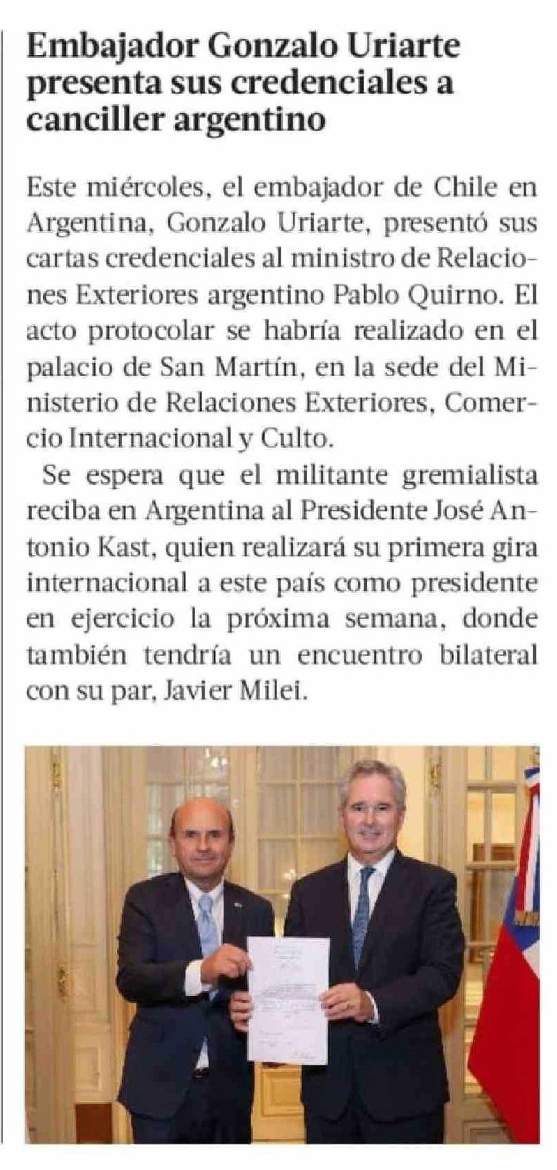 Embajador Gonzalo Uriarte presenta sus credenciales a canciller argentino