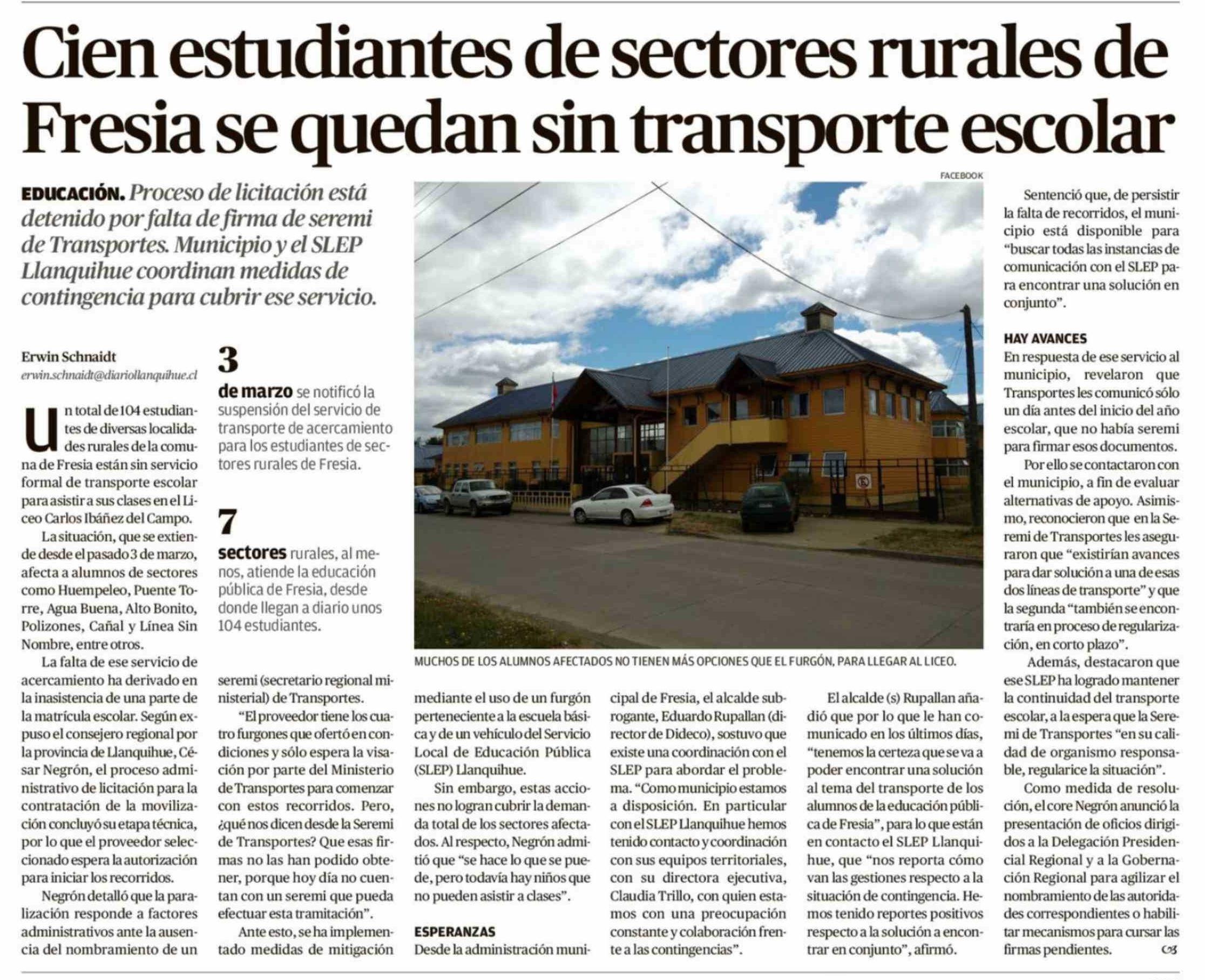 Cien estudiantes de sectores rurales de Fresia se quedan sin transporte escolar