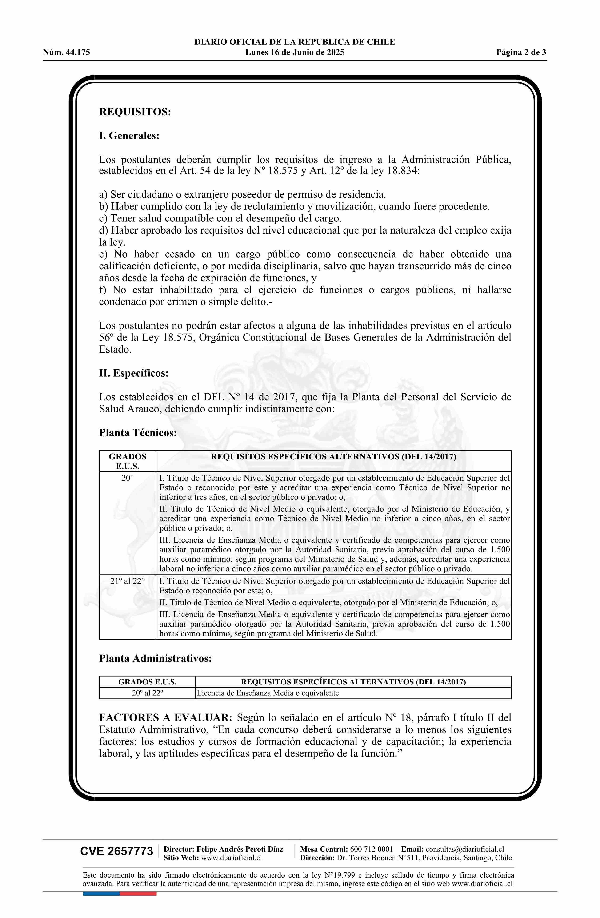 | Título: | AVISO LICITACIONES: Llama a concurso público de ingreso para proveer cargos de planta de los estamentos técnicos y administrativos en el Servicio de Salud Arauco |