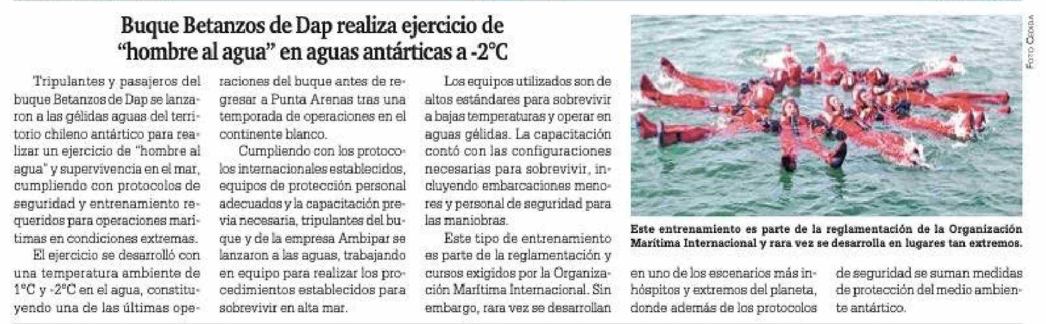 Buque Betanzos de Dap realiza ejercicio de "hombre al agua" en aguas antárticas a -2?