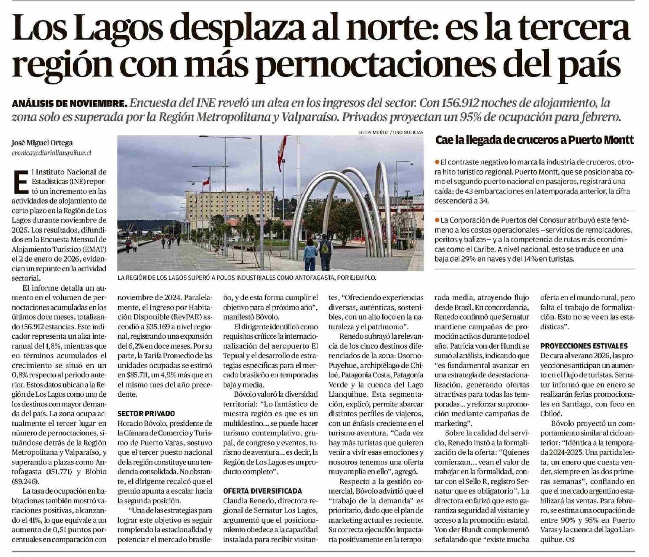 Los Lagos desplaza al norte: es la tercera región con más pernoctaciones del país