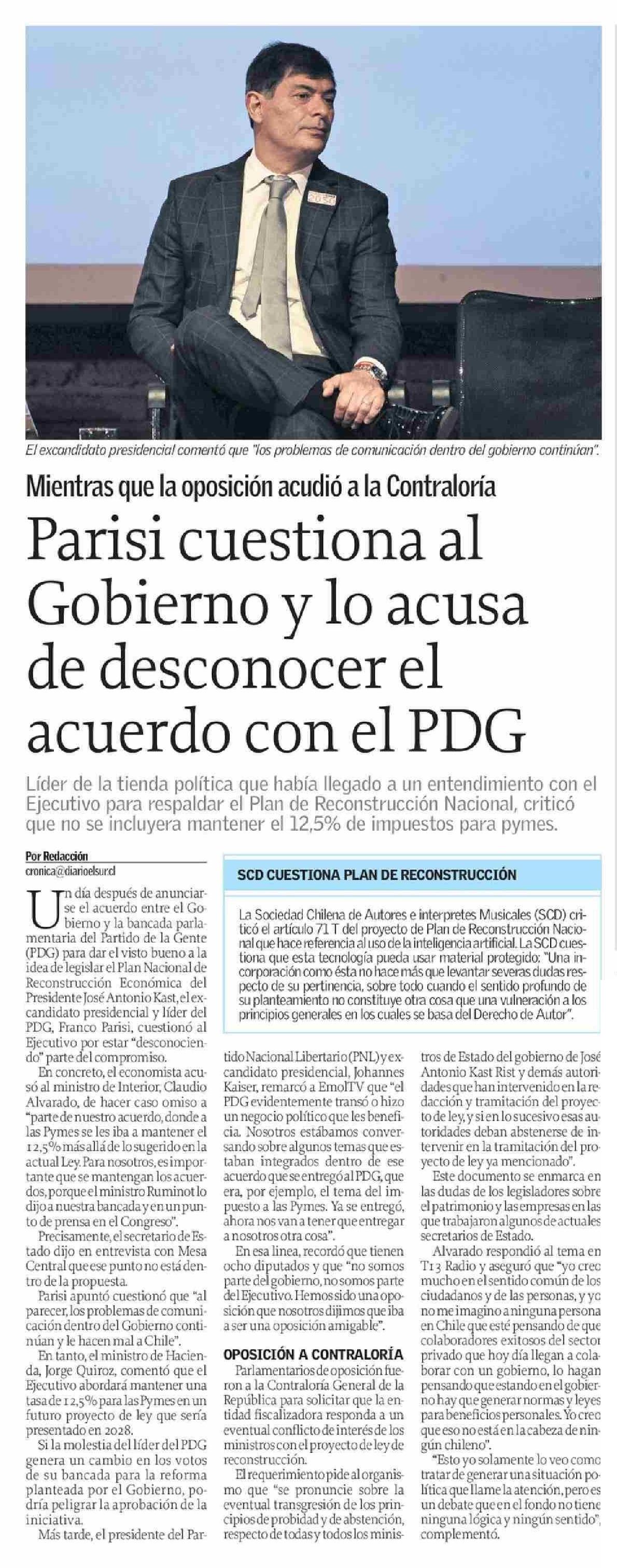Parisi cuestiona al Gobierno y lo acusa de desconocer el acuerdo con el PDG