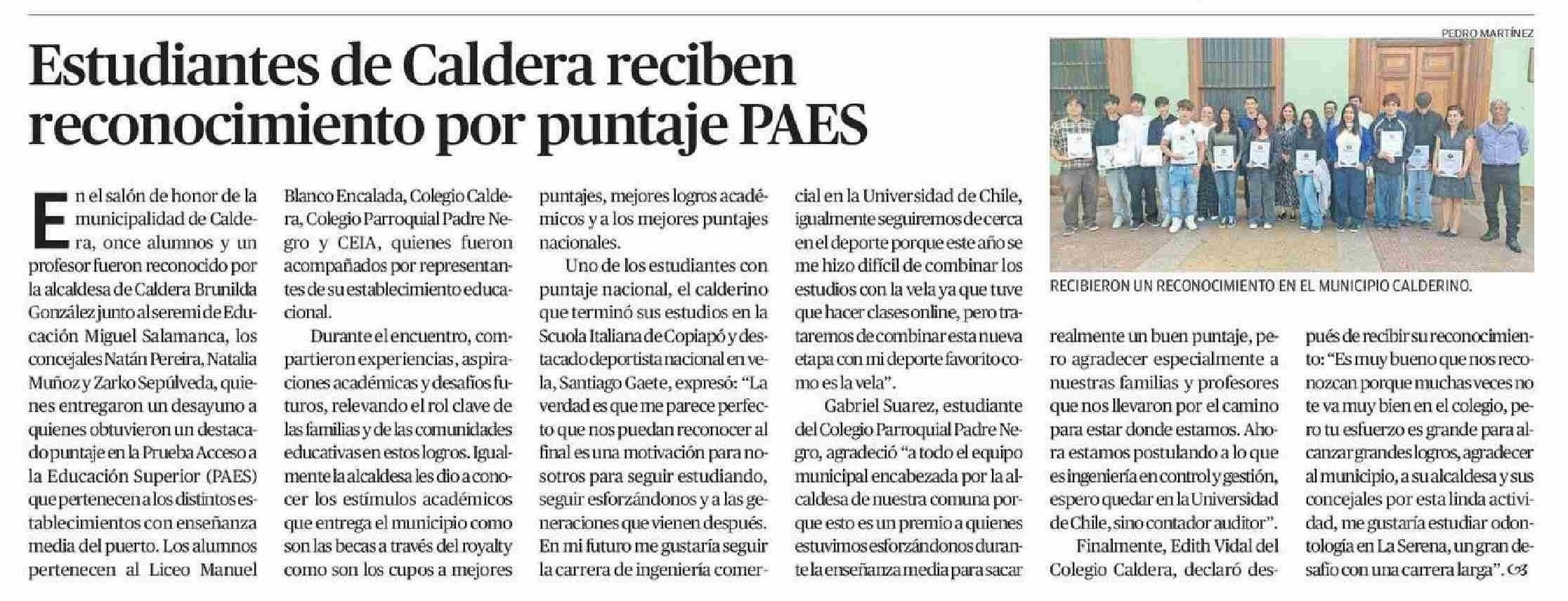 Estudiantes de Caldera reciben reconocimiento por puntaje PAES