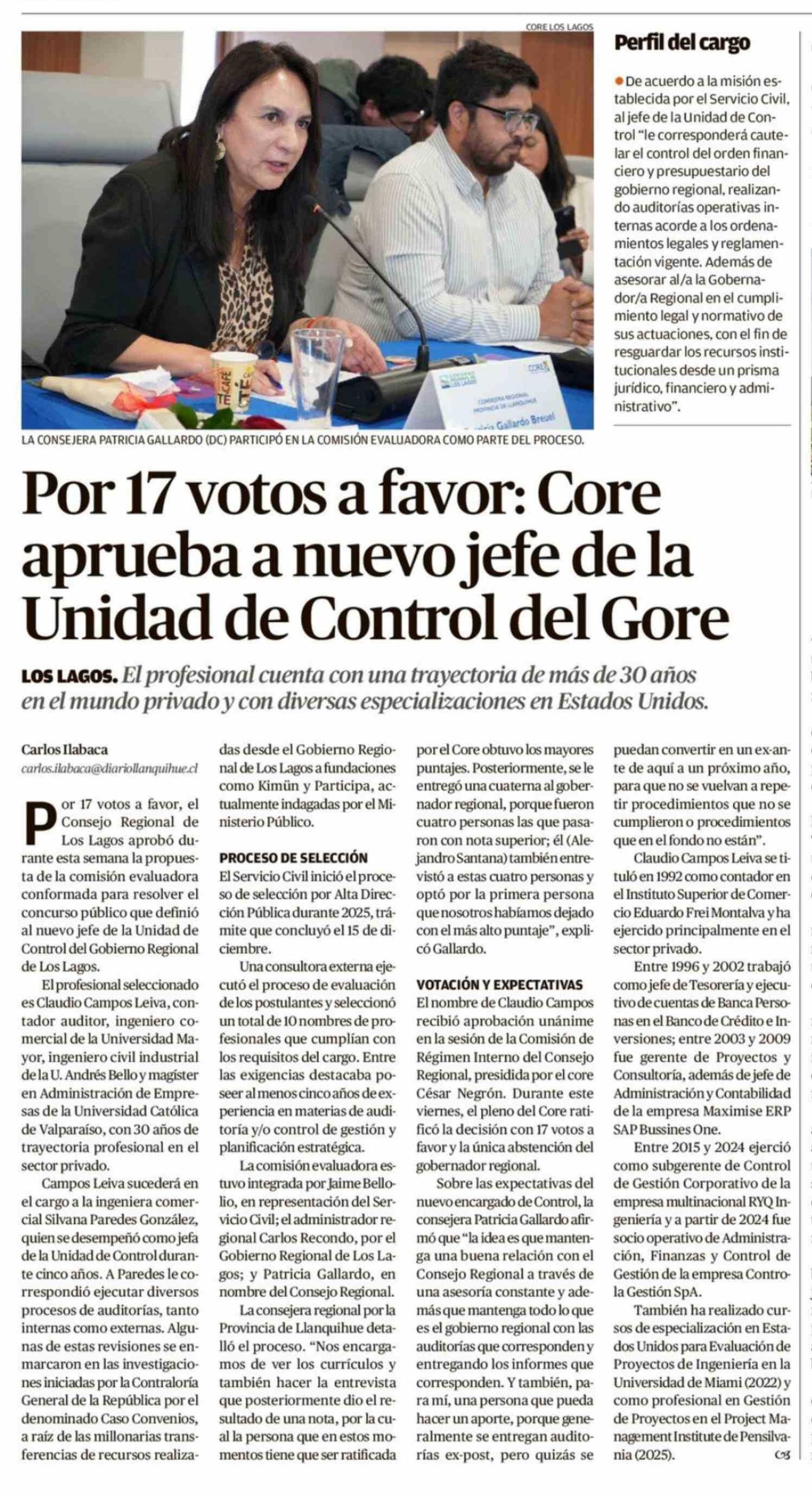 Por 17 votos a favor: Core aprueba a nuevo jefe de la Unidad de Control del Gore