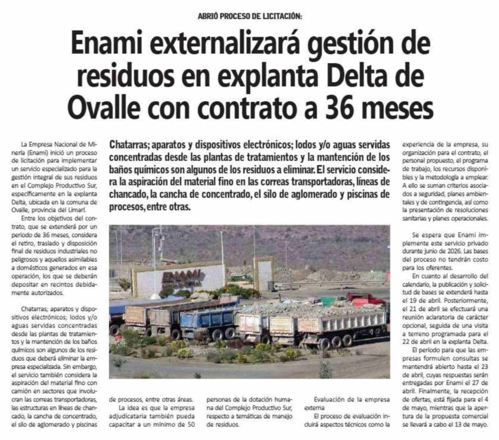 Enami externalizará gestión de residuos en explanta Delta de Ovalle con contrato a 36 meses
