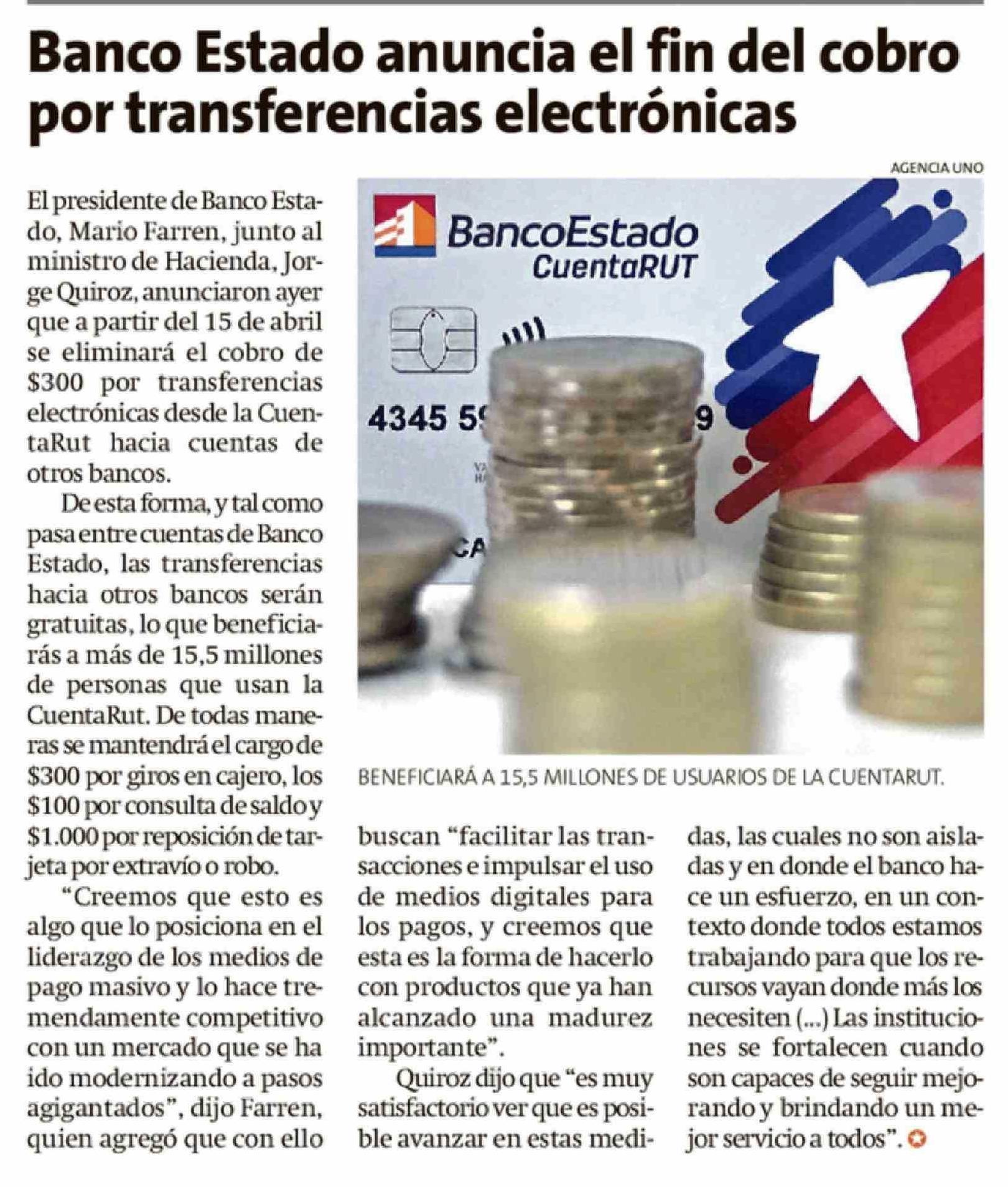 Banco Estado anuncia el fin del cobro por transferencias electrónicas