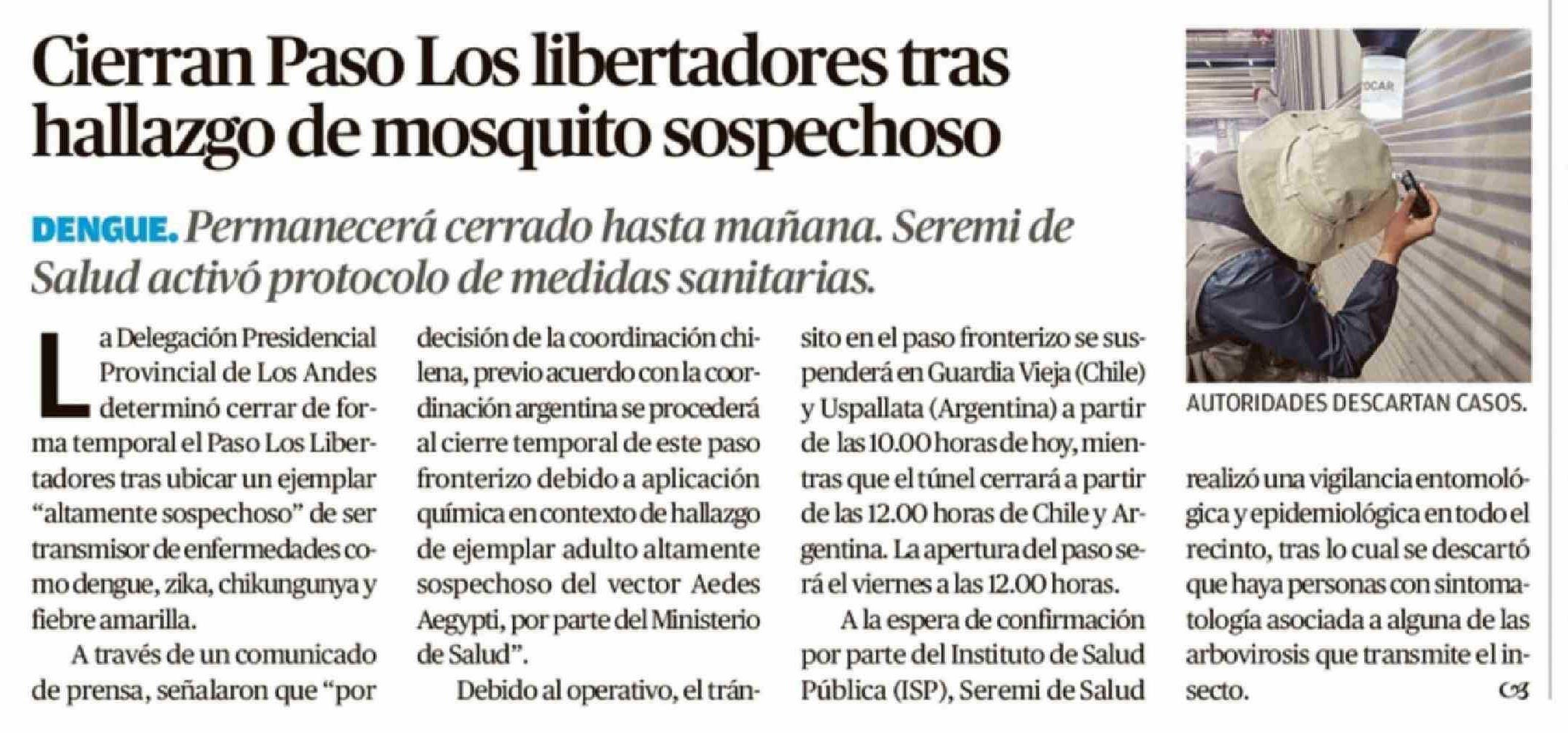 Cierran Paso Los libertadores tras hallazgo de mosquito sospechoso