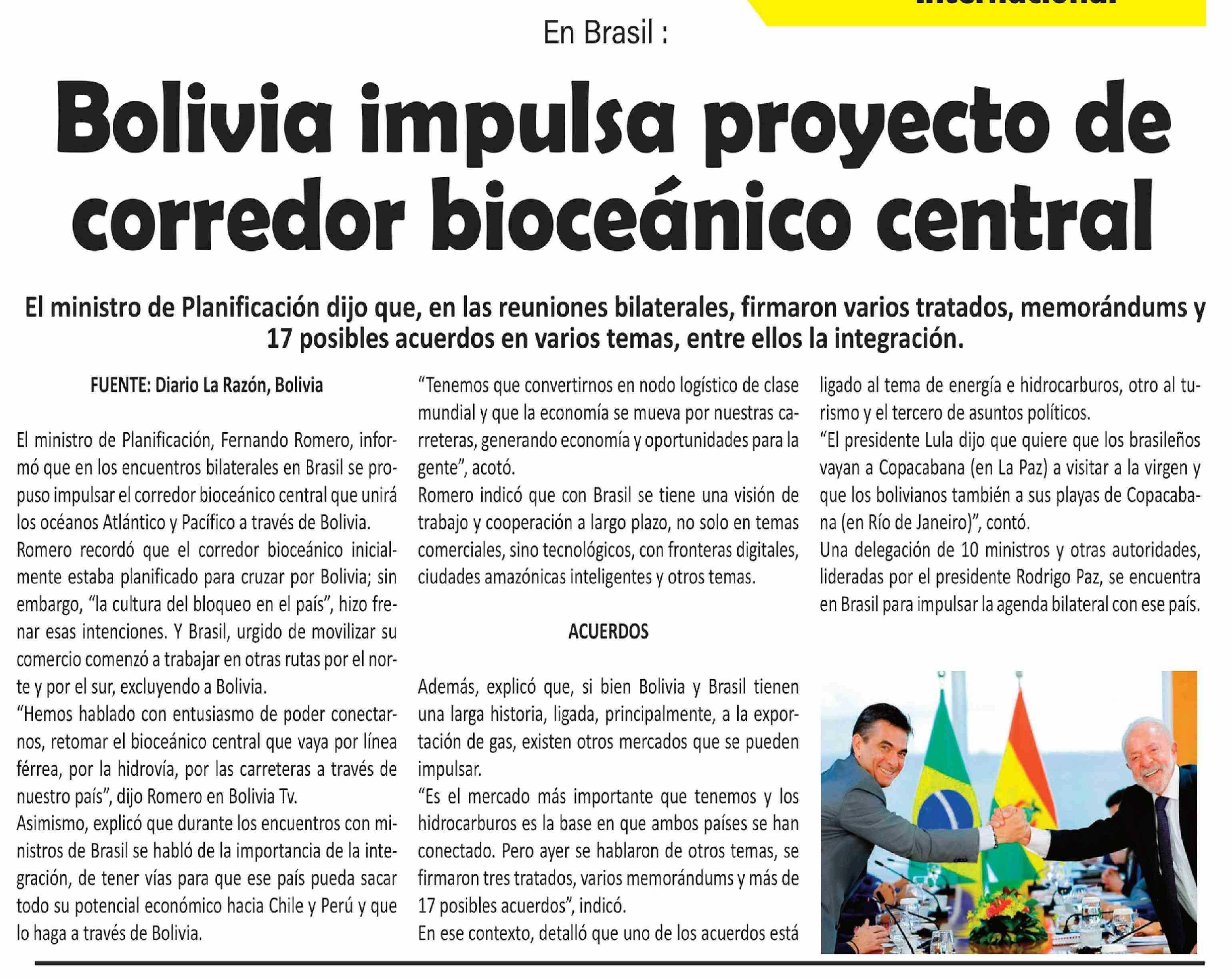 Bolivia impulsa proyecto de corredor bioceánico central