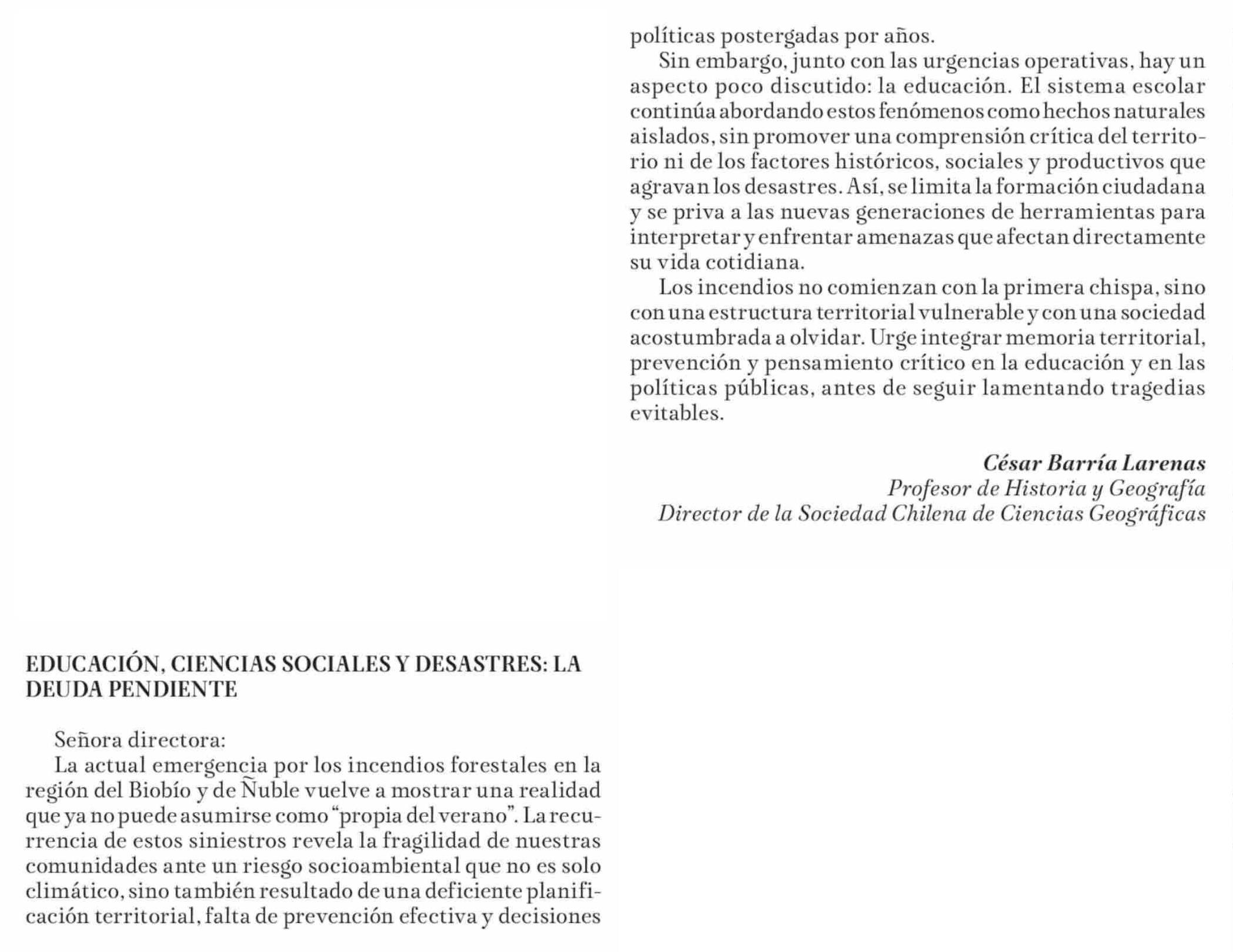 Título: Cartas: EDUCACIÓN, CIENCIAS SOCIALES Y DESASTRES: LA DEUDA PENDIENTE