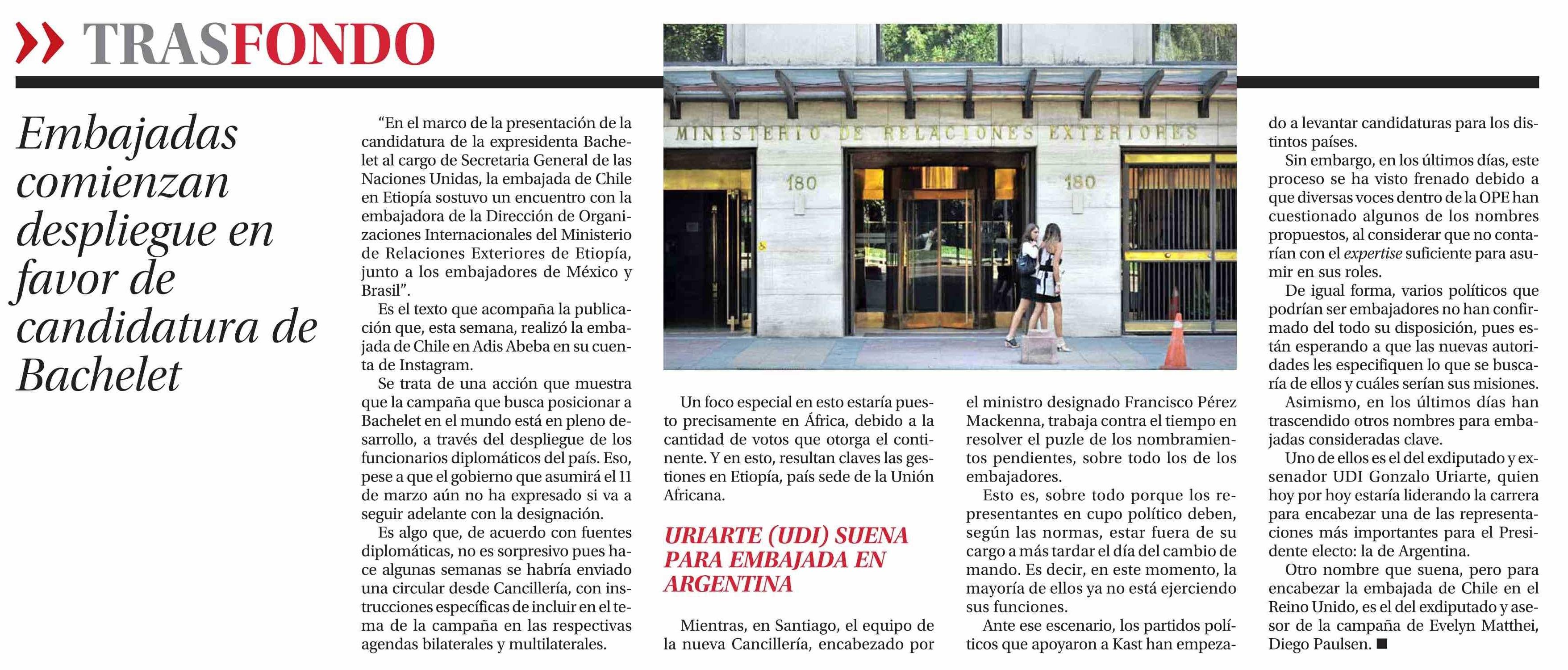 Embajadas comienzan despliegue en favor de candidatura de Bachelet