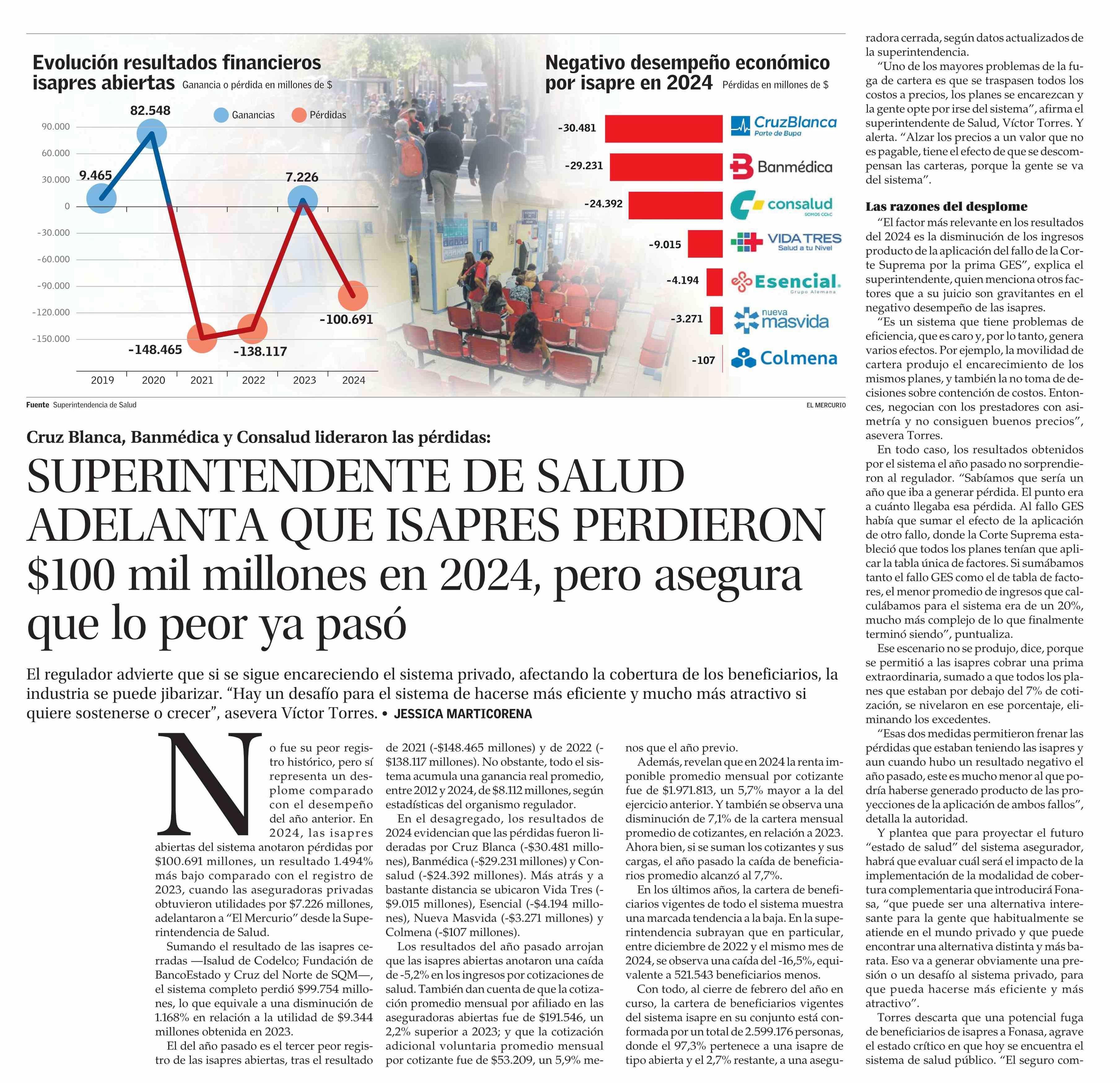 SUPERINTENDENTE DE SALUD ADELANTA QUE ISAPRES PERDIERON $100 mil millones en 2024, pero asegura que lo peor ya pasó