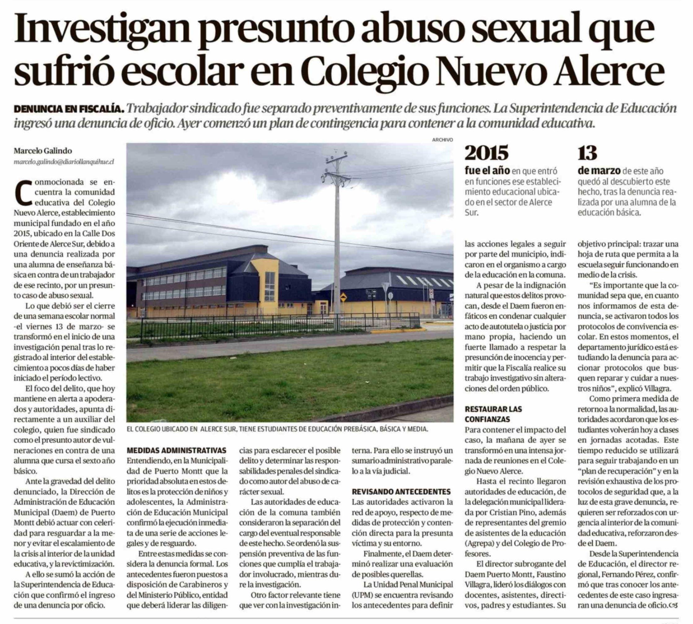 Investigan presunto abuso sexual que sufrió escolar en Colegio Nuevo Alerce