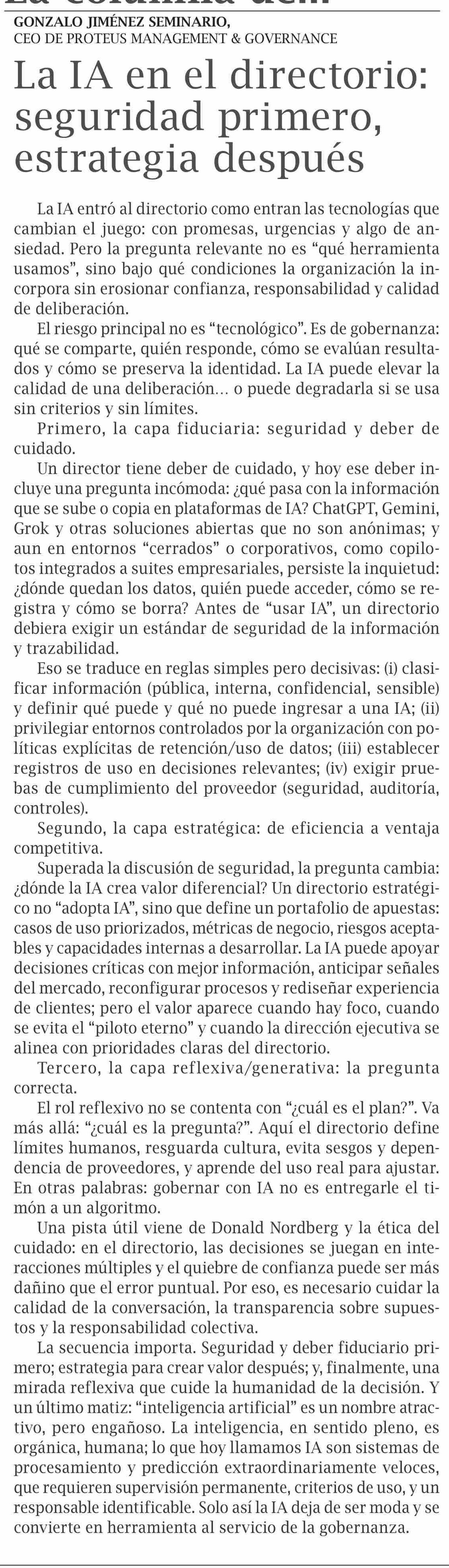 Columnas de Opinión: La IA en el directorio: seguridad primero, estrategia después