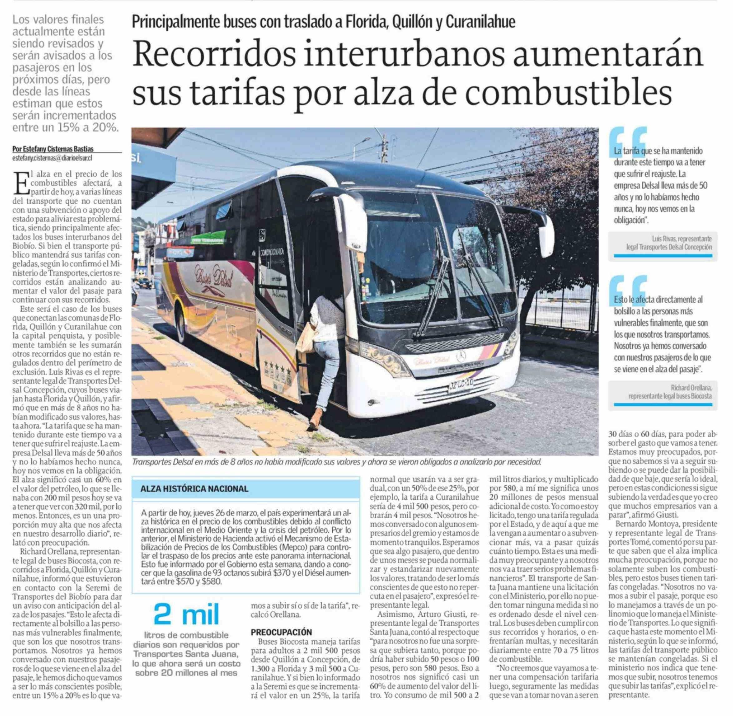 Recorridos interurbanos aumentarán sus tarifas por alza de combustibles
