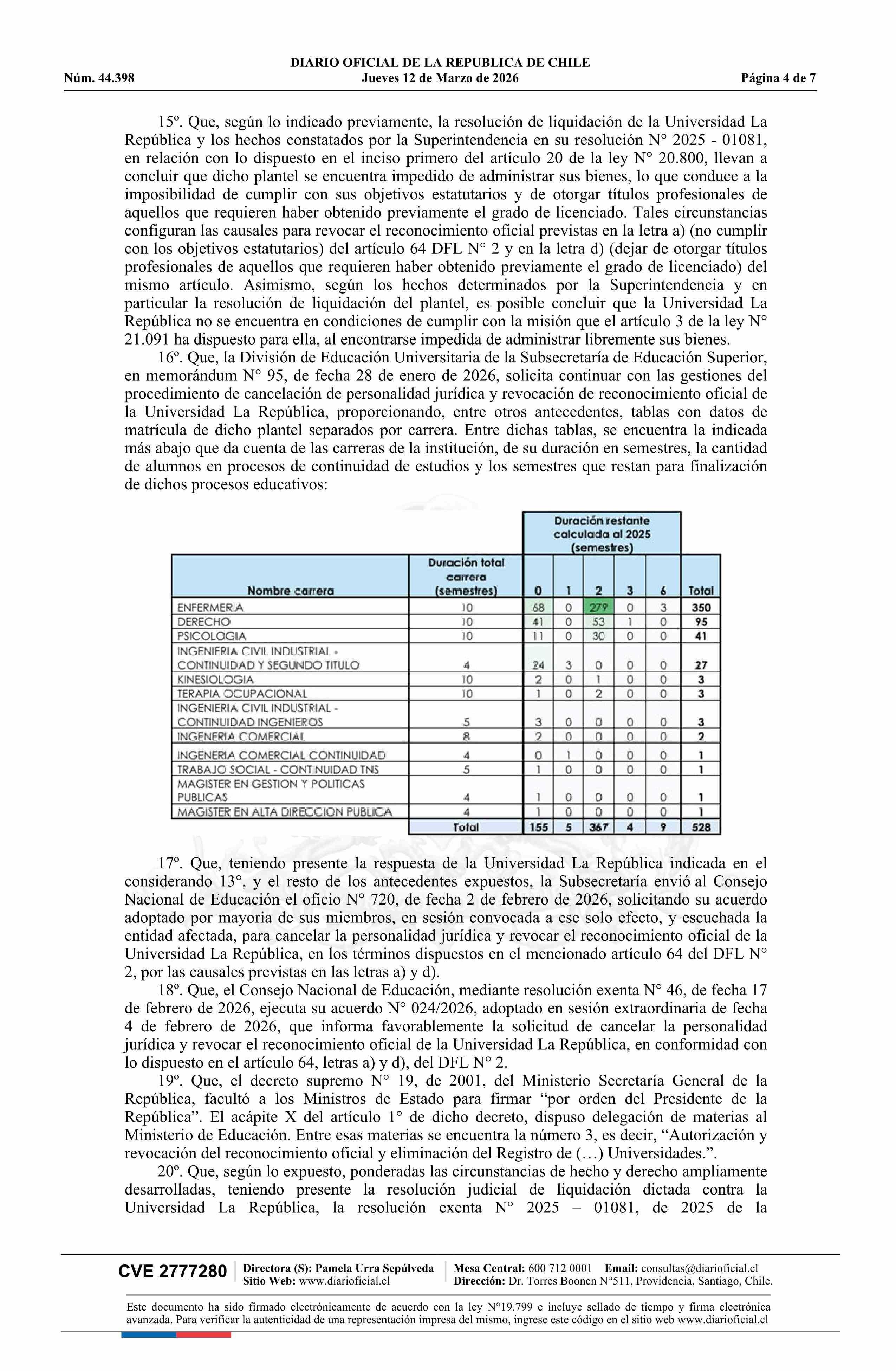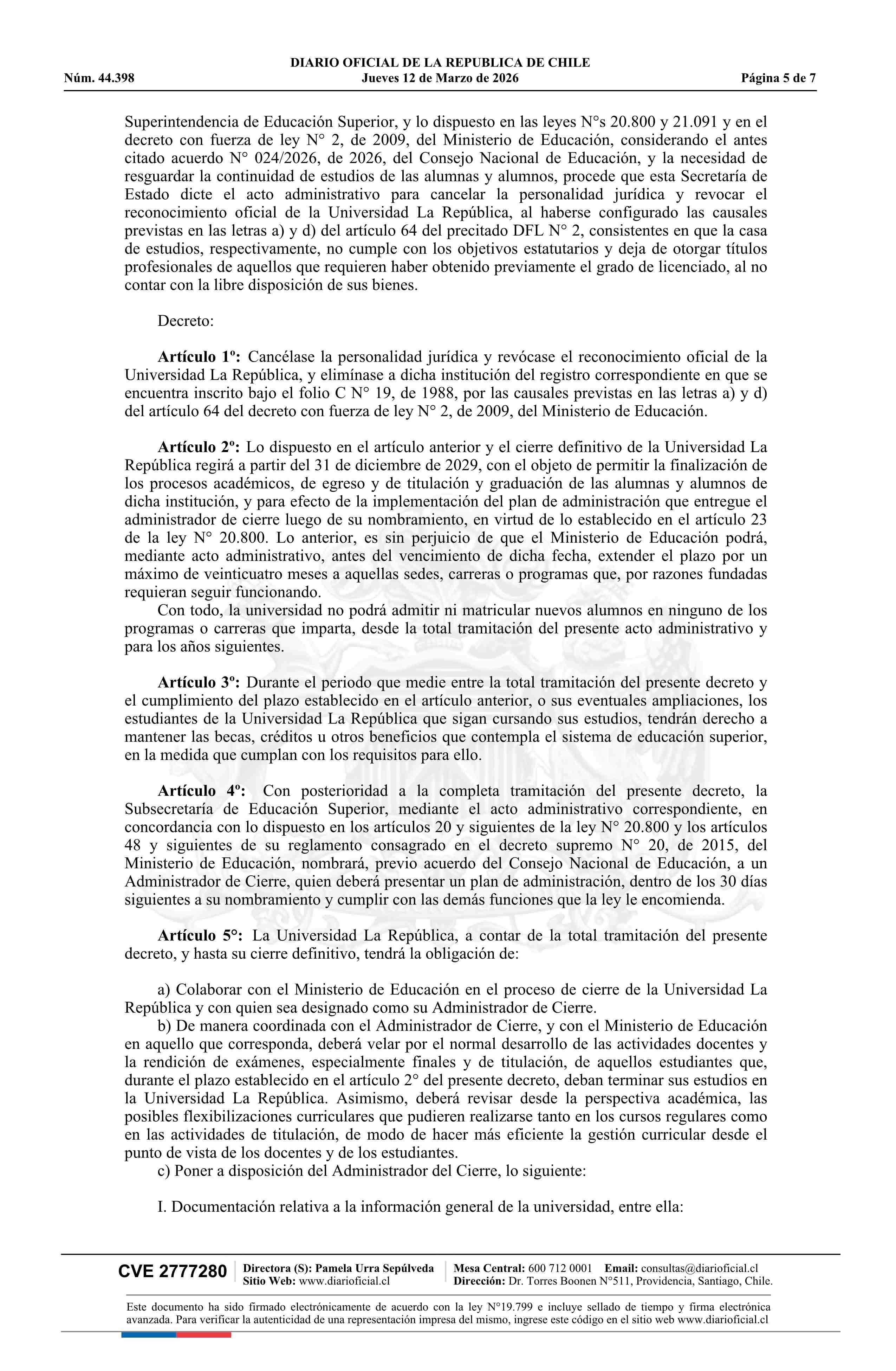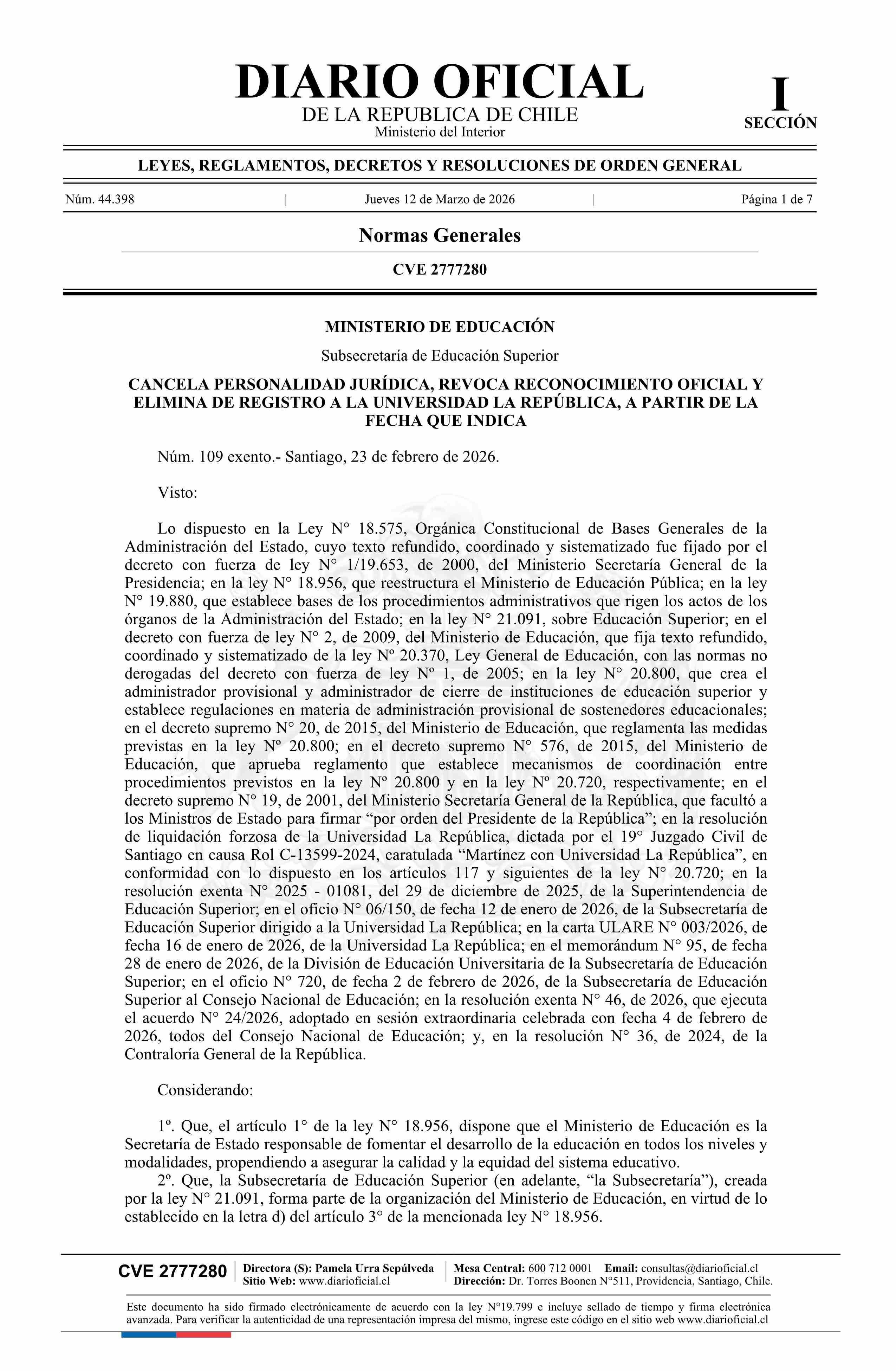 | Título: | Decreto exento número 109, de 2026.- Cancela personalidad jurídica, revoca reconocimiento oficial y elimina de registro a la Universidad La República, a partir de la fecha que indica |