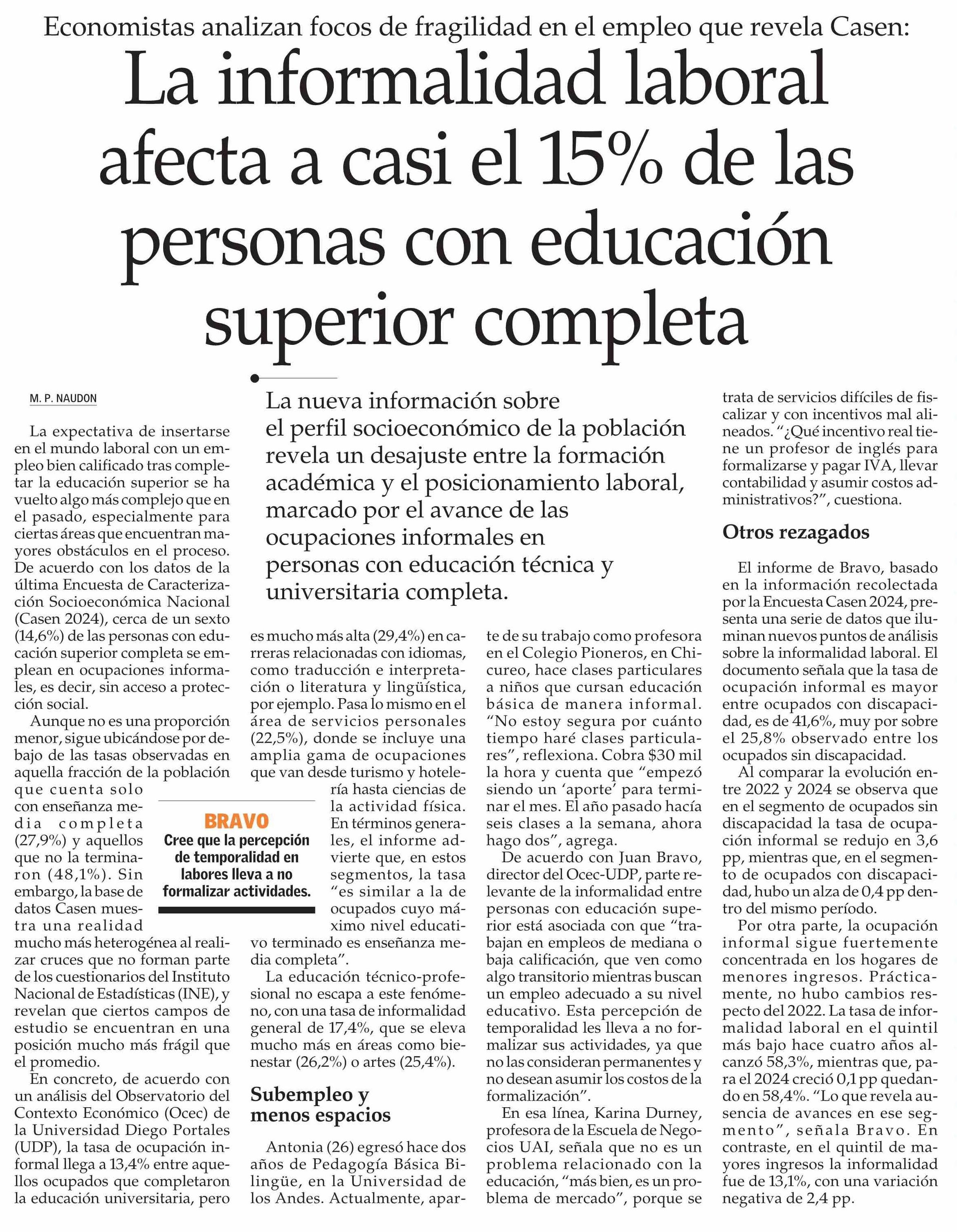 La informalidad laboral afecta a casi el 15% de las personas con educación superior completa