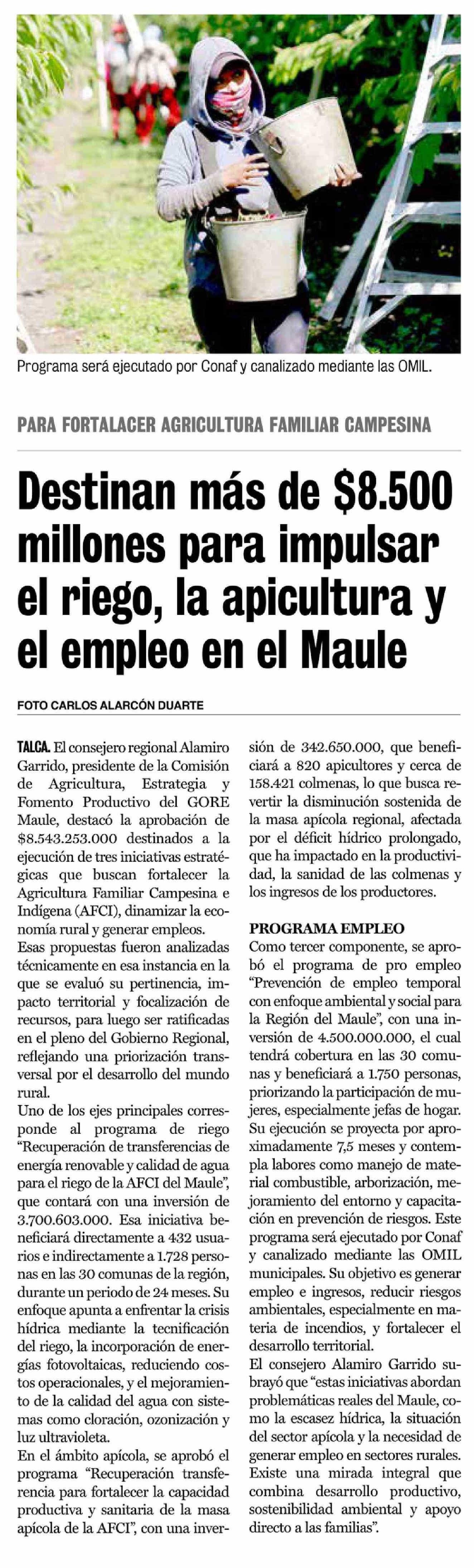 Título: Destinan más de $8.500 millones para impulsar el riego, la apicultura y el empleo en el Maule