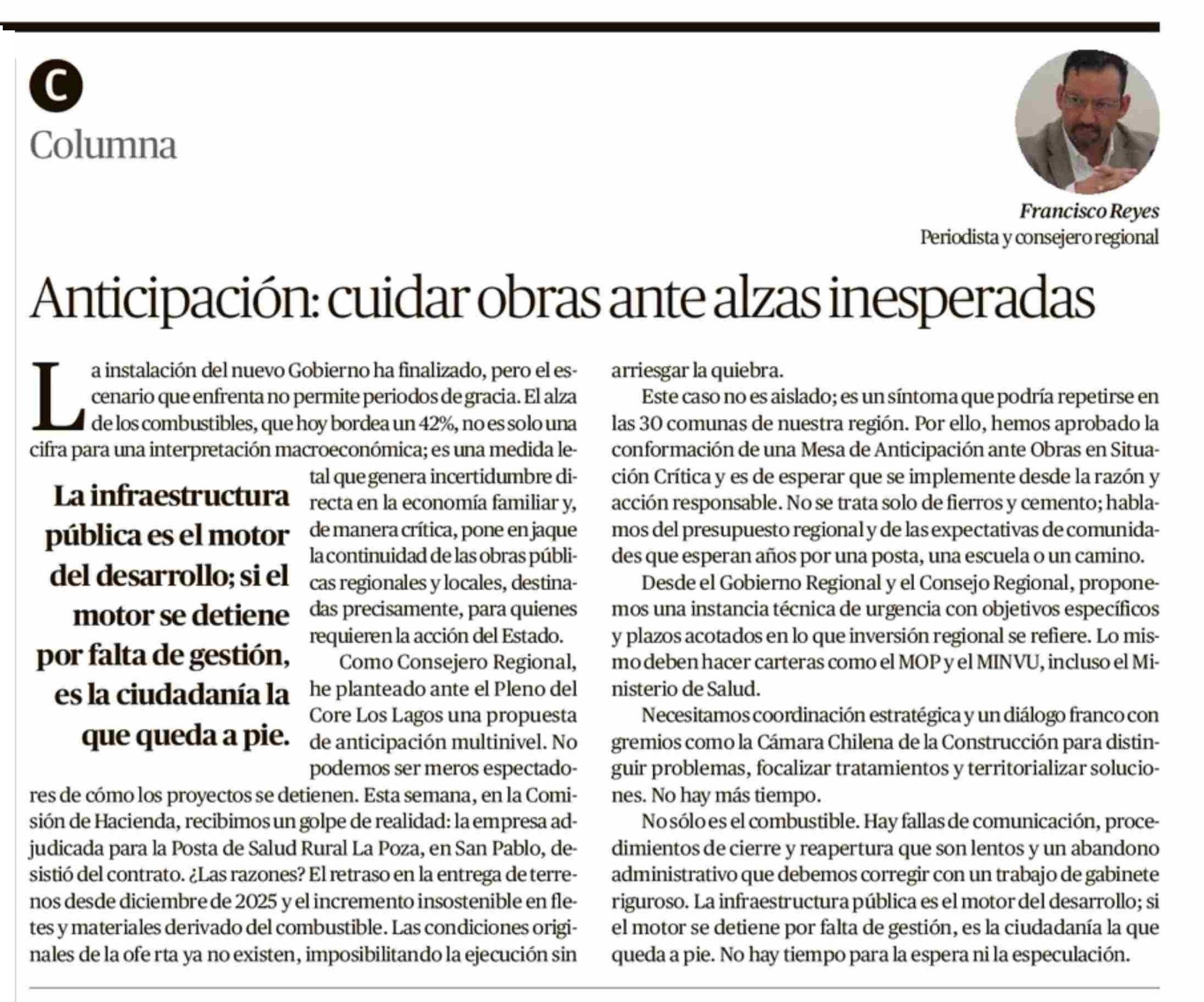 COLUMNAS DE OPINIÓN: Anticipación cuidar obras ante alzas inesperadas
