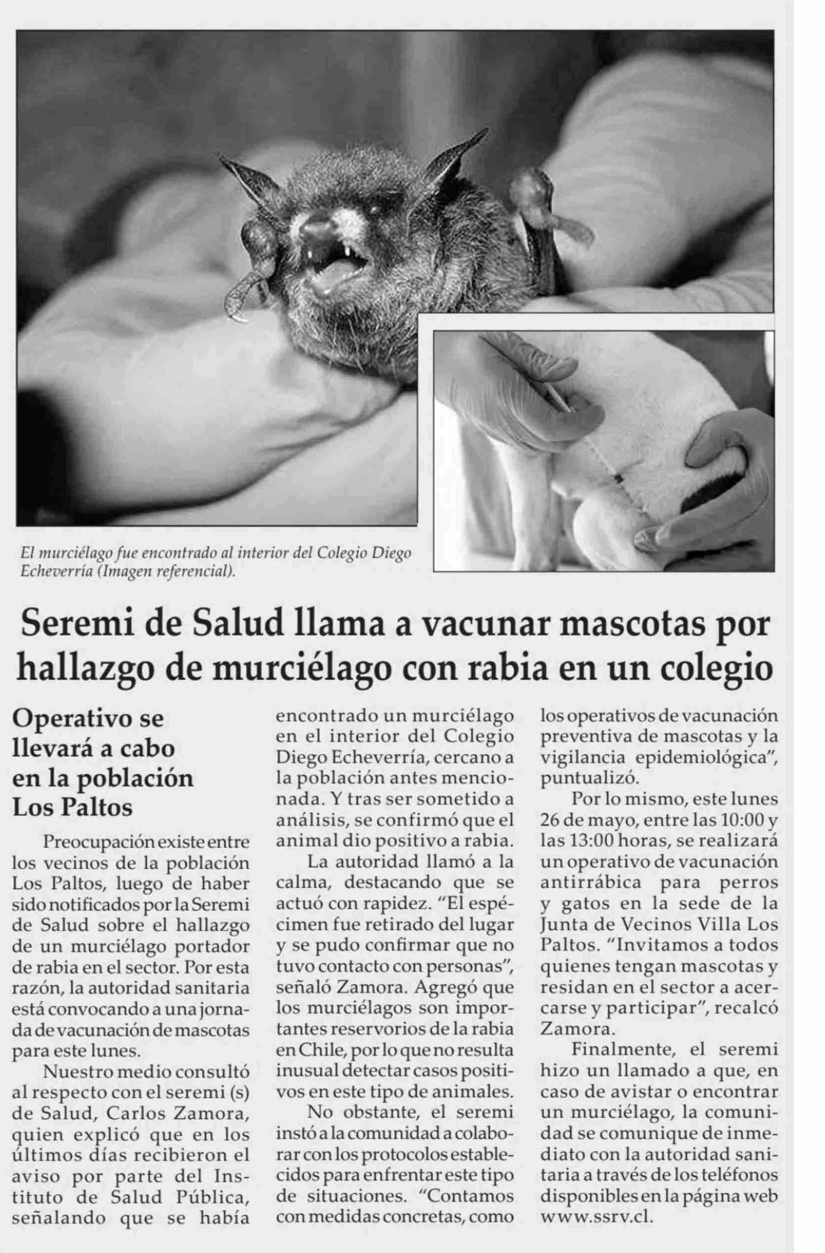 Seremi de Salud llama a vacunar mascotas por hallazgo de murciélago con rabia en un colegio