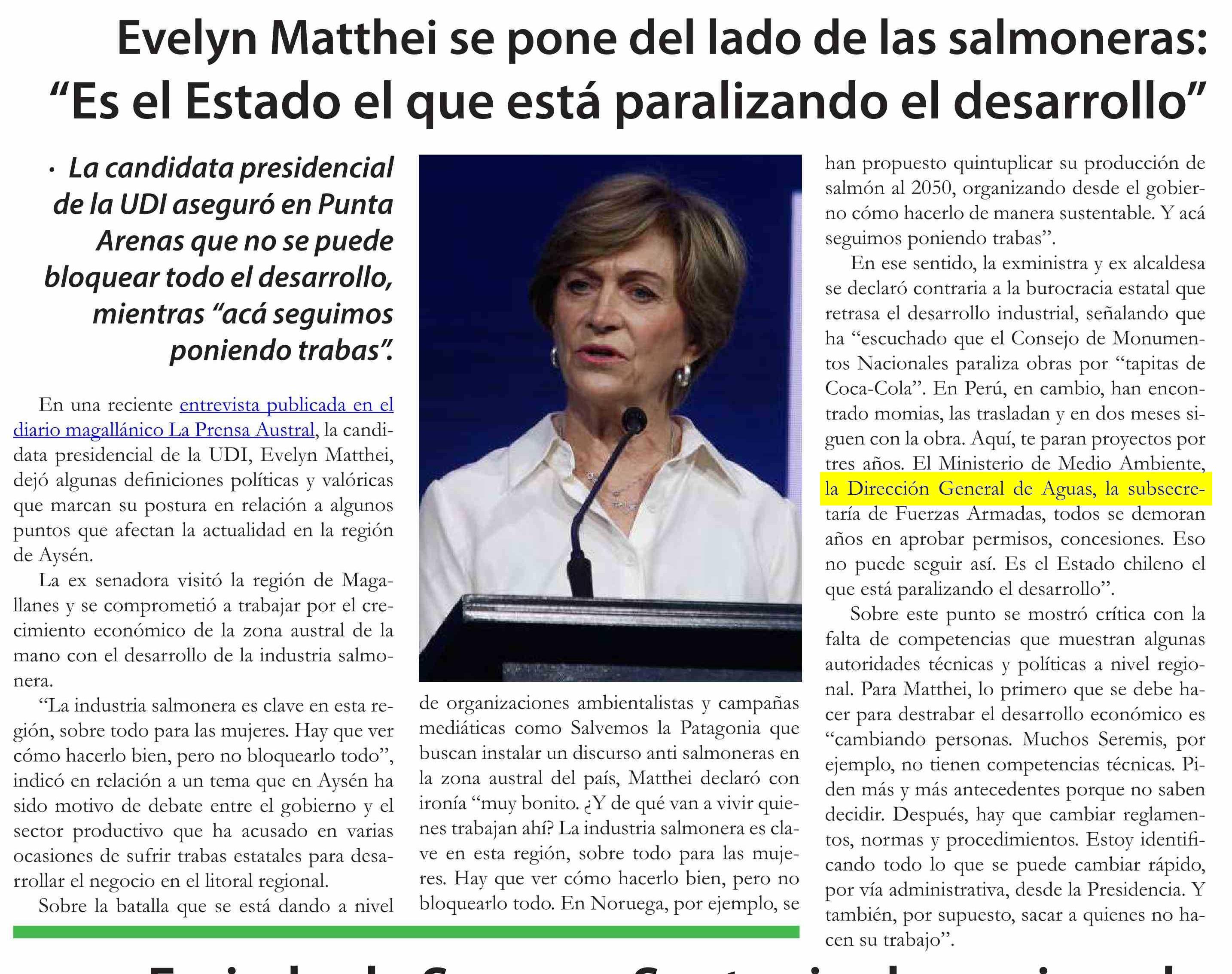 Evelyn Matthei se pone del lado de las salmoneras: “Es el Estado el que está paralizando el desarrollo”