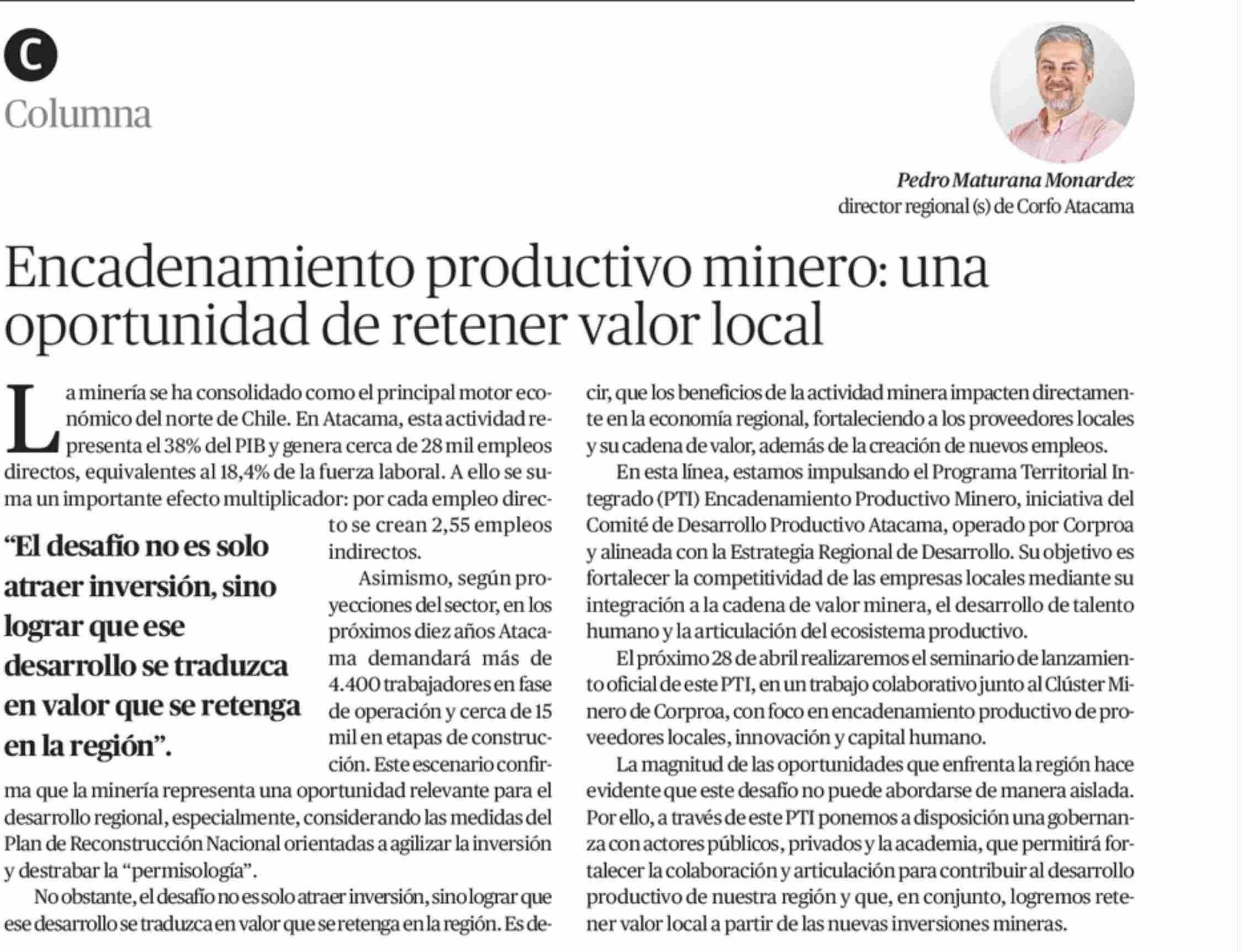 Título: COLUMNAS DE OPINIÓN: Encadenamiento productivo minero: una oportunidad de retener valor local