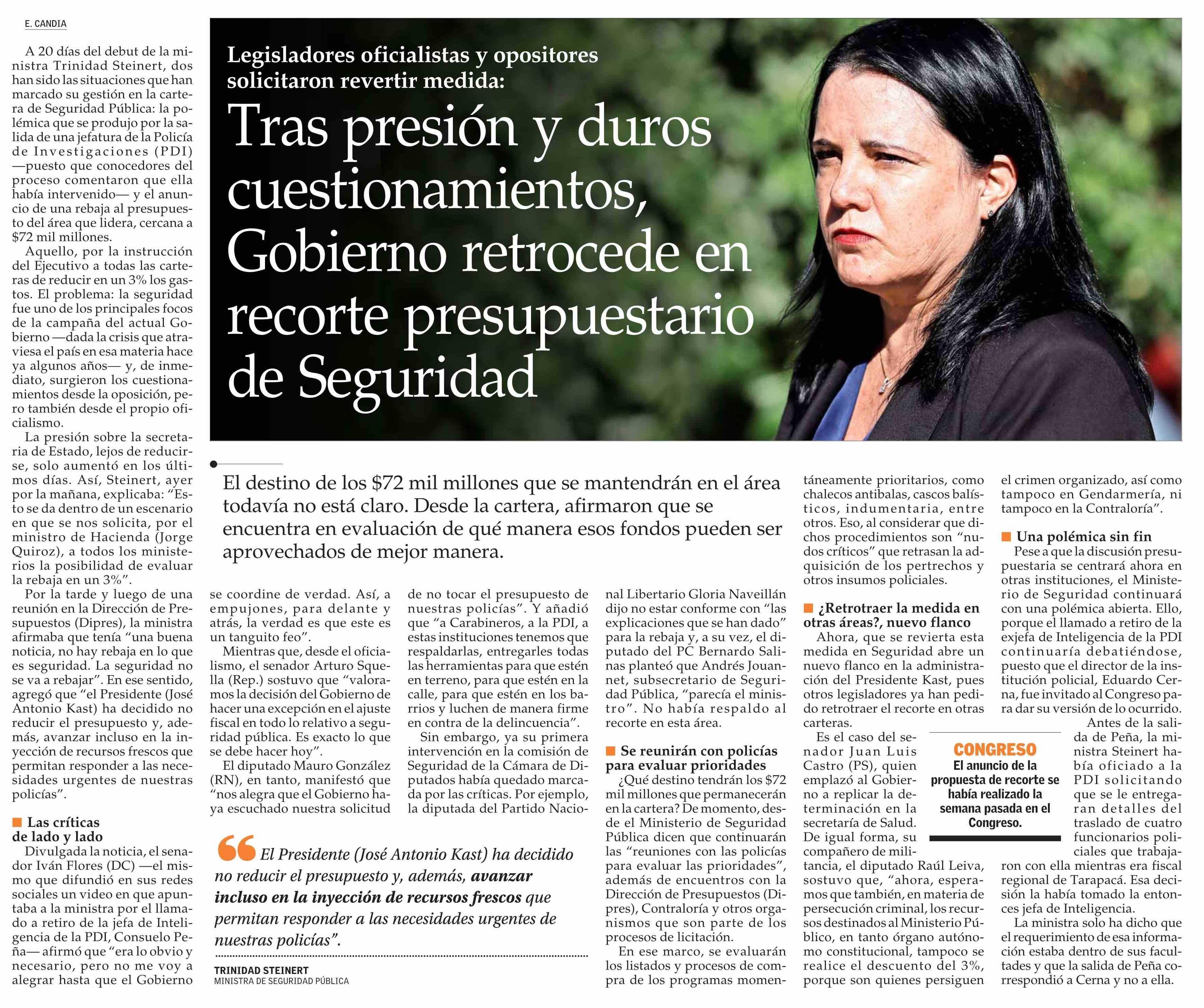 Tras presión y duros cuestionamientos, Gobierno retrocede en recorte presupuestario de Seguridad