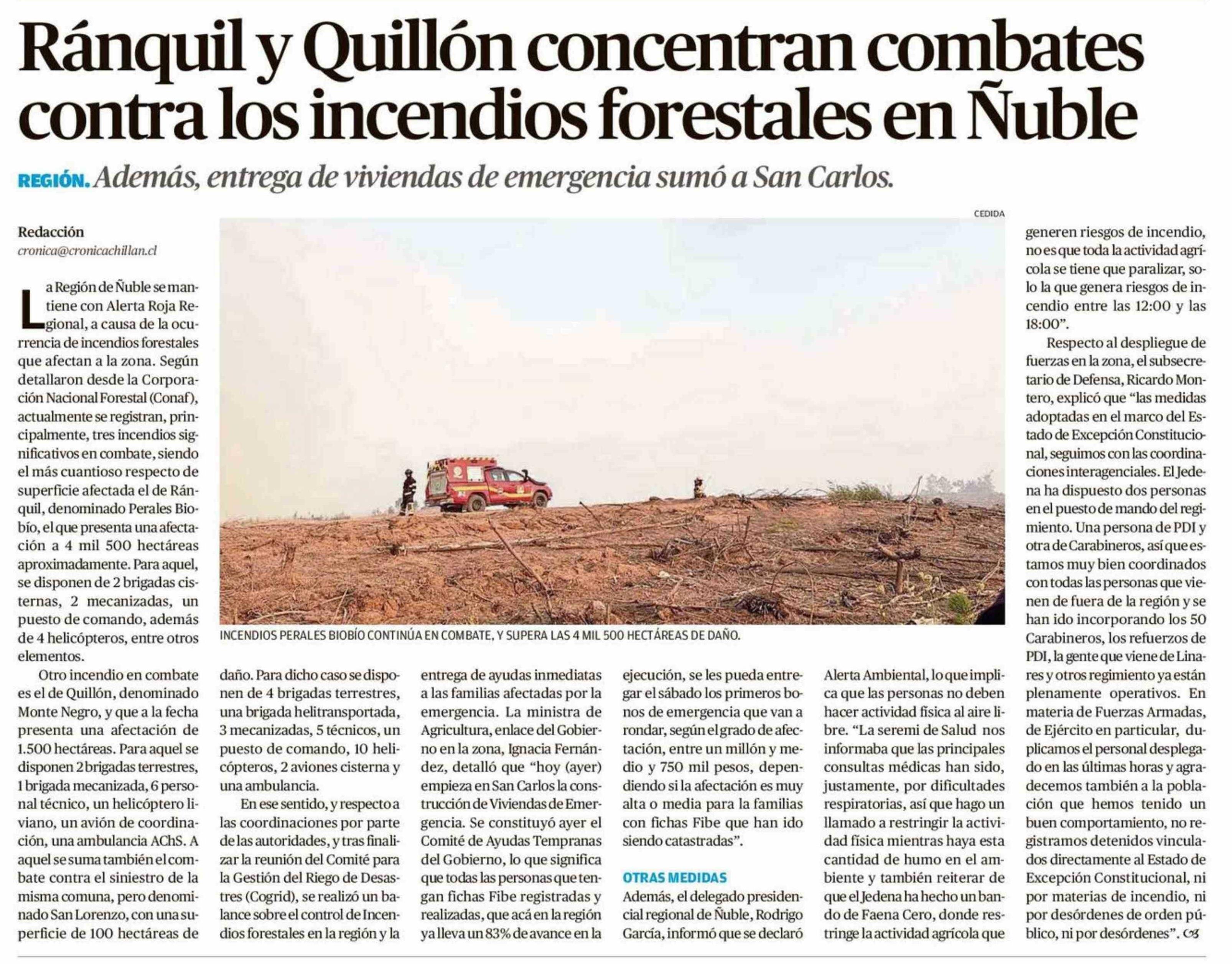 Ránquil y Quillón concentran combates contra los incendios forestales en Ñuble