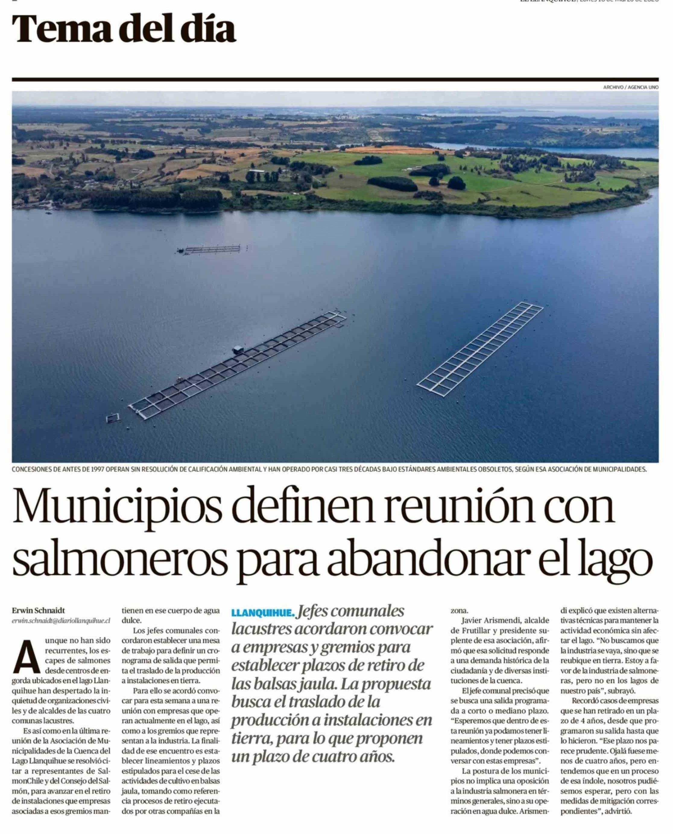 Municipios definen reunión con salmoneros para abandonar el lago