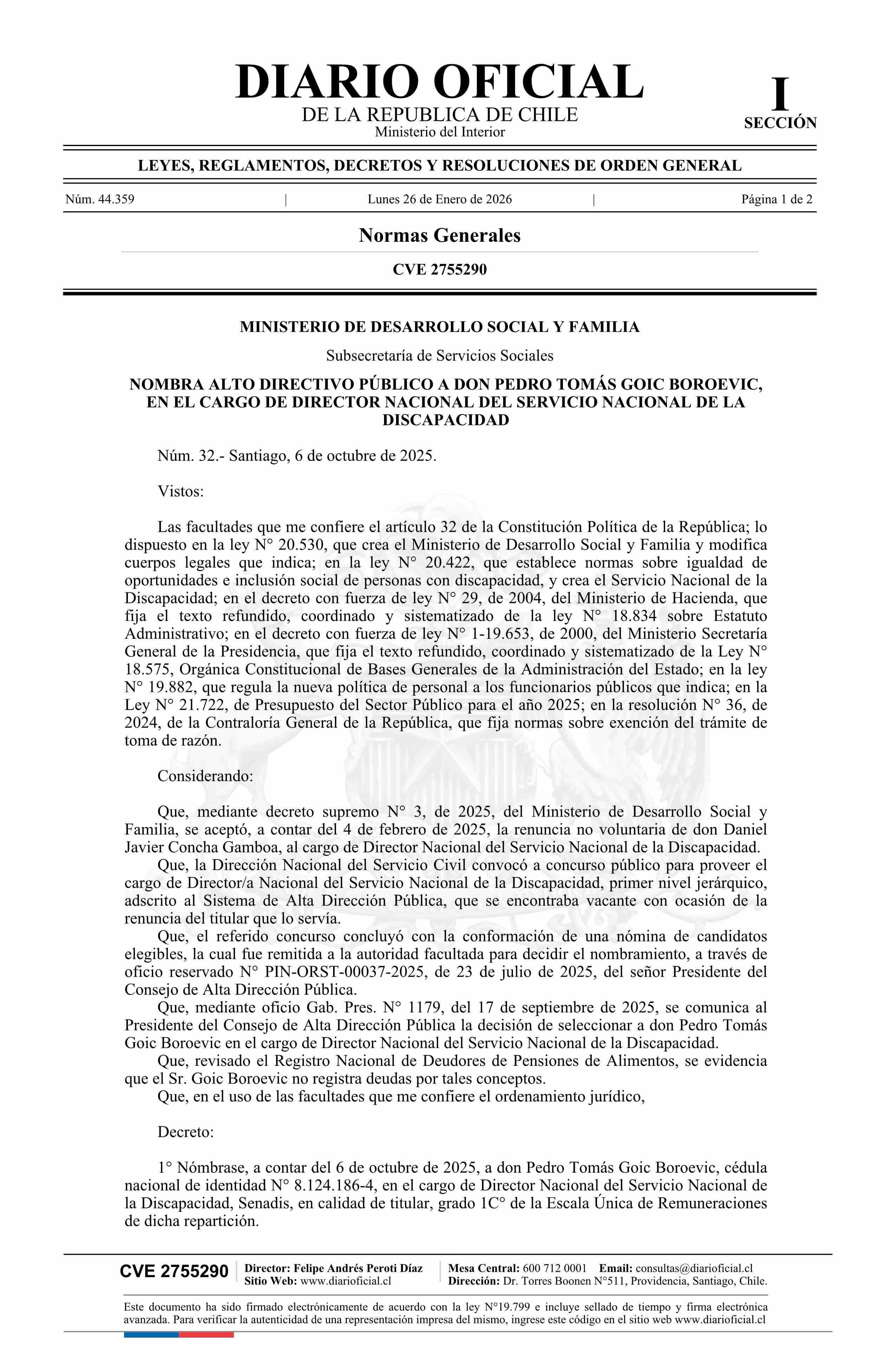 | Título: | Decreto número 32, de 2025.- Nombra alto directivo público a don Pedro Tomás Goic Boroevic, en el cargo de Director Nacional del Servicio Nacional de la Discapacidad |