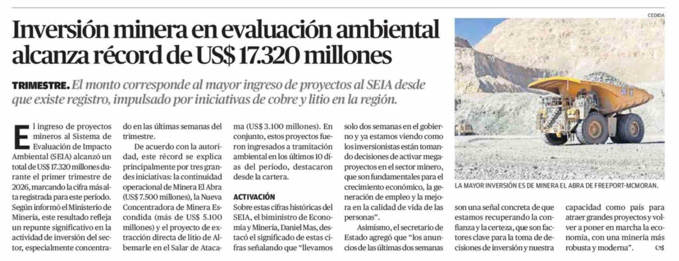 Título: Inversión minera en evaluación ambiental alcanza récord de US$ 17.320 millones