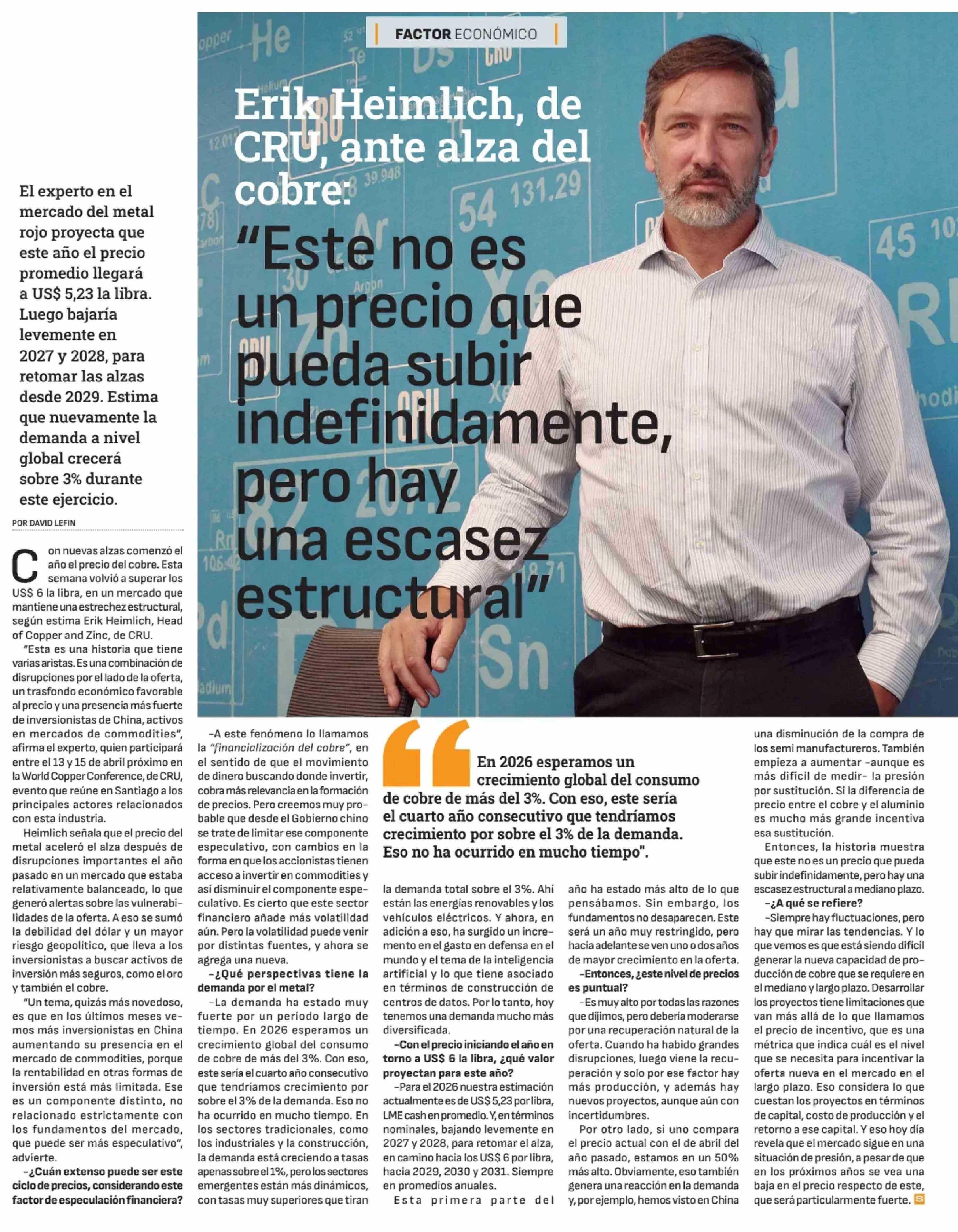 | Título: | Erik Heimlich, de CRU, ante alza del cobre: "Este no es un precio que pueda subir indefinidamente, pero hay una escasez estructural" |