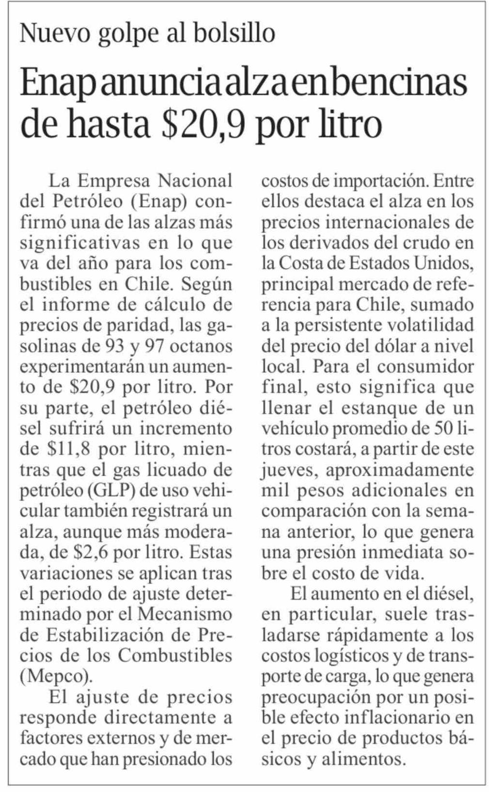 Enap anuncia alza enbencinas de hasta $20,9 por litro