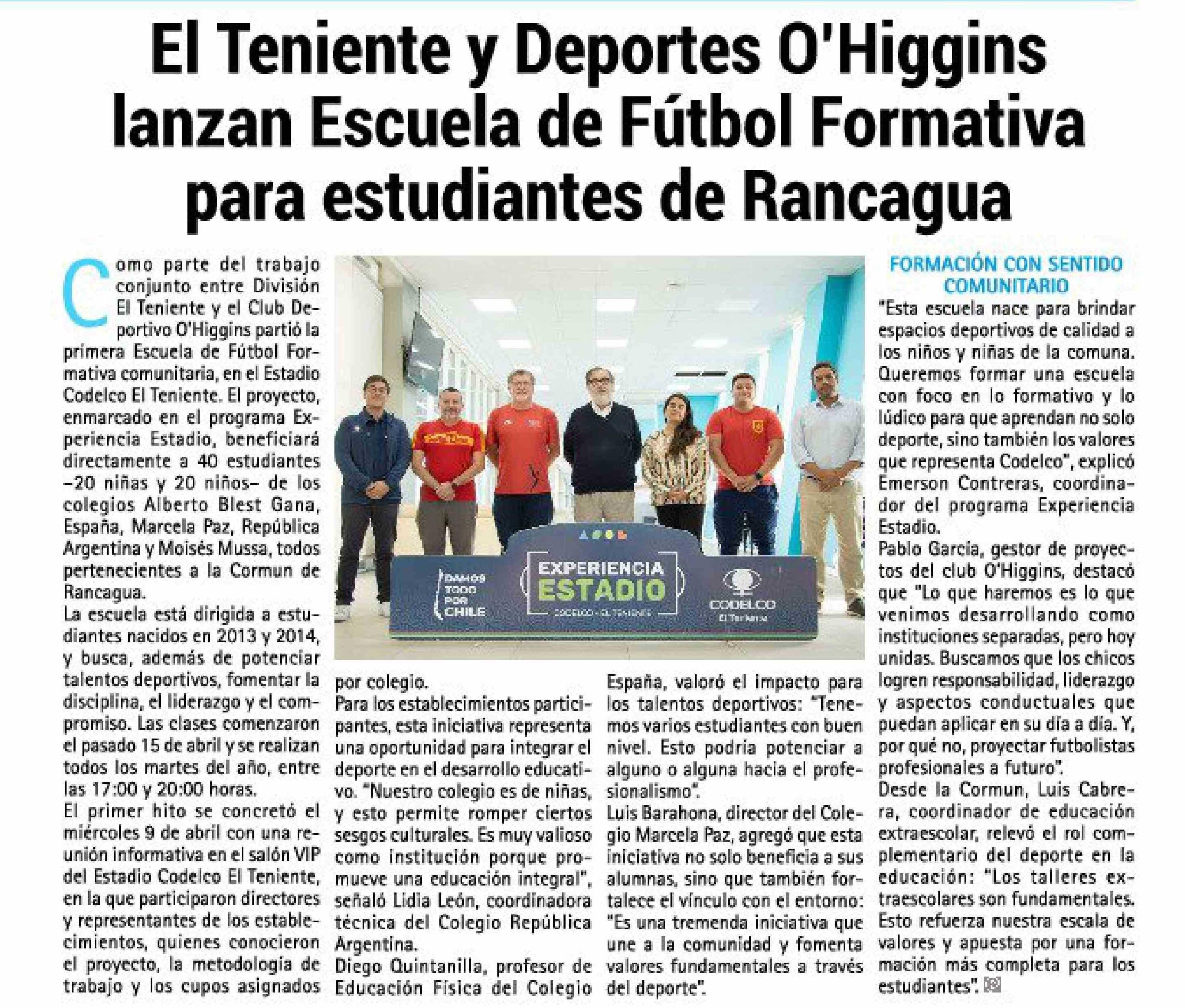 El Teniente y Deportes O'Higgins lanzan Escuela de Fútbol Formativa para estudiantes de Rancagua
