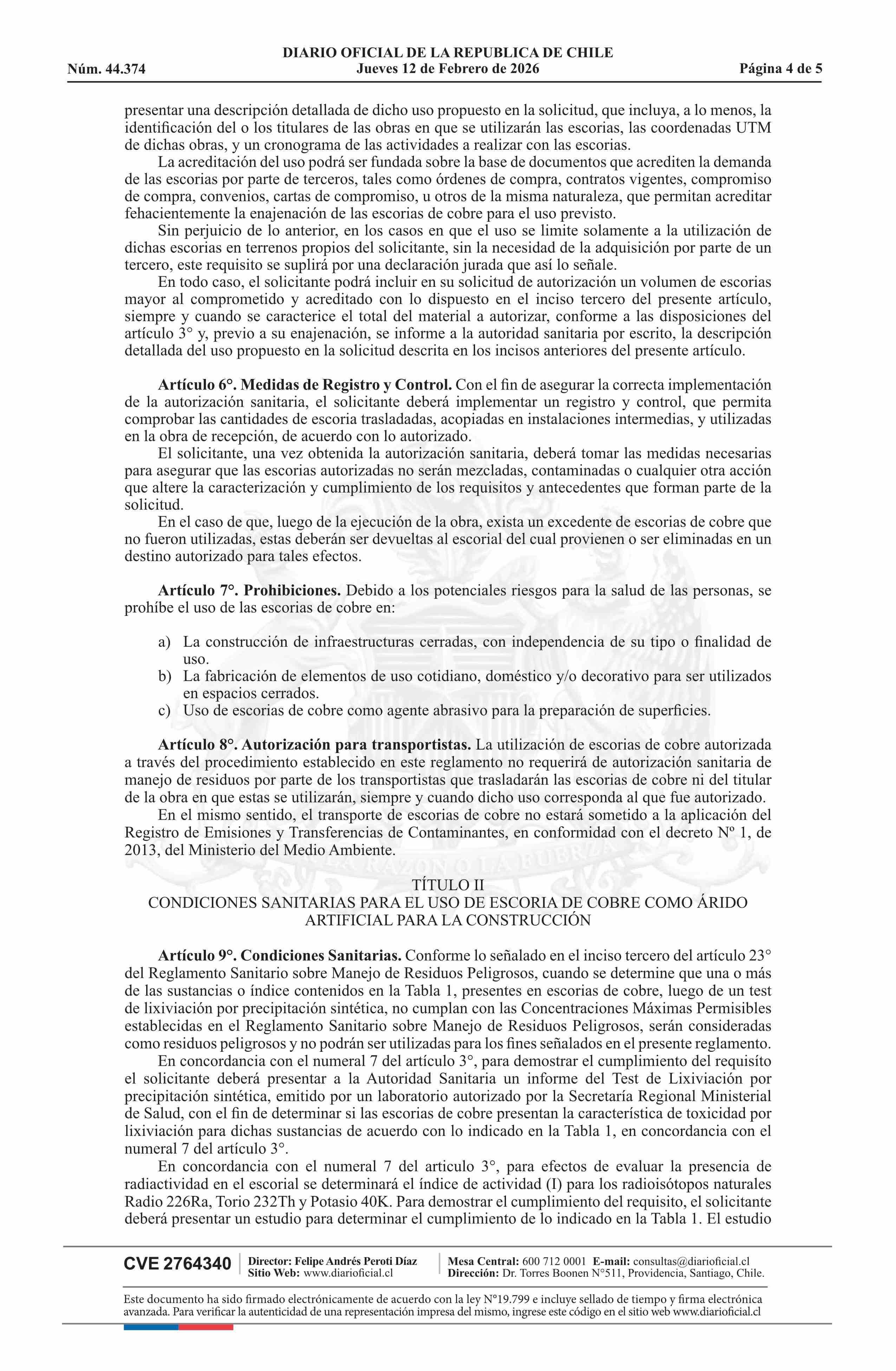 Título: Decreto número 46, de 2025.- Aprueba Reglamento que establece los requisitos para autorizar el uso de escorias de cobre como áridos artificiales para la construcción