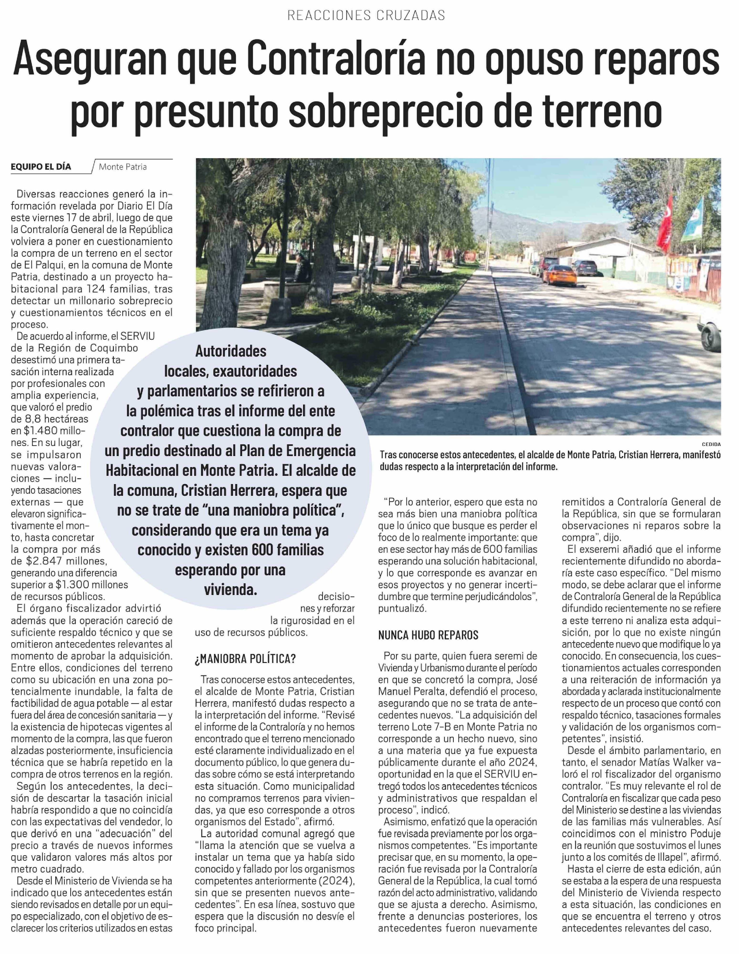 Aseguran que Contraloría no opuso reparos por presunto sobreprecio de terreno