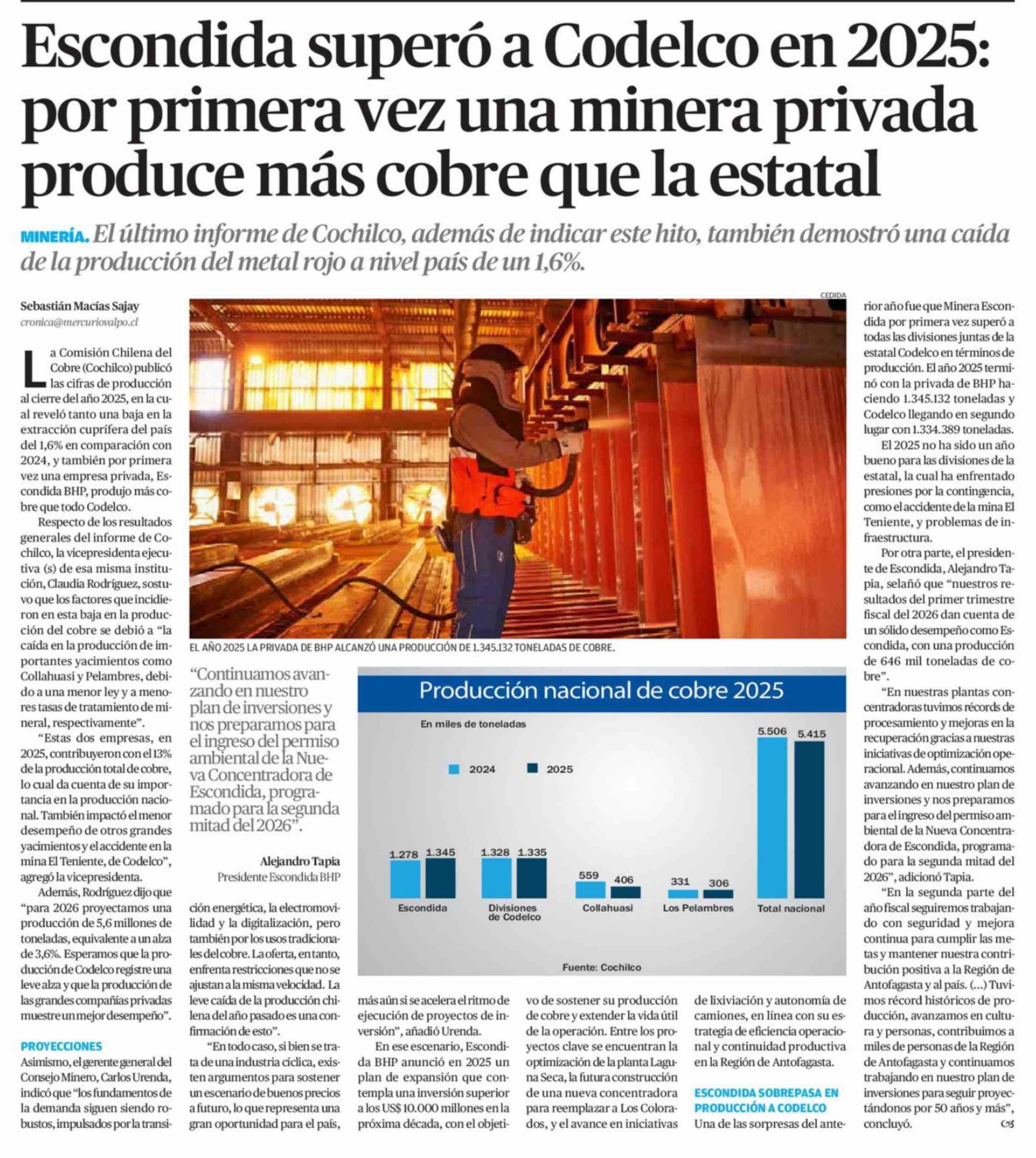 Escondida superó a Codelco en 2025: por primera vez una minera privada produce más cobre que la estatal