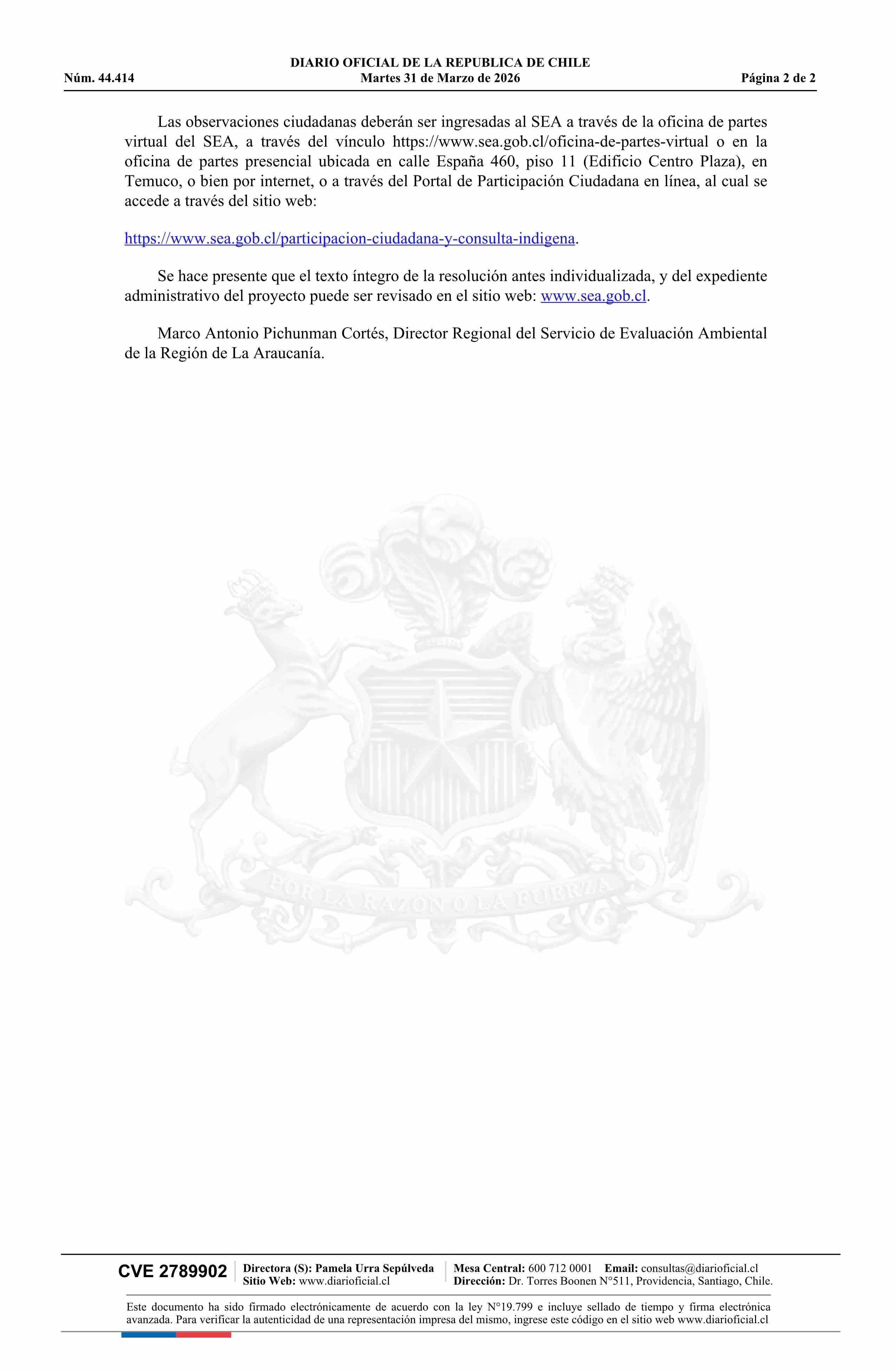 | Título: | Extracto de resolución exenta número 20260900112, de 2026.- Notifica resolución de inicio de nuevo proceso de participación ciudadana en Declaración de Impacto Ambiental del Proyecto Parque Residencial Los Cipreses 2 |