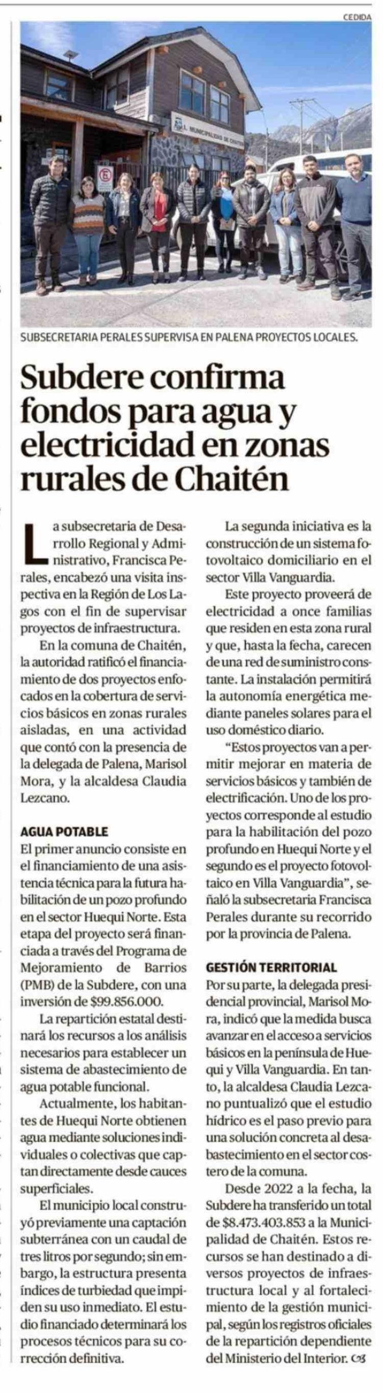 Subdere confirma fondos para agua y electricidad en zonas rurales de Chaitén