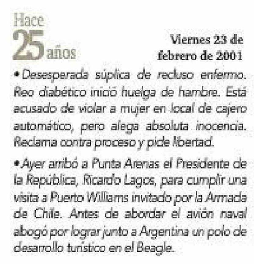 | Título: | Viernes 23 de febrero de 2001 años * Desesperada súplica de recluso enfermo. Reo diabético inició huelga de hambre. Está acusado de violar a mujer en local de cajero automático, pero alega absoluta inocencia. Reclama contra proceso y pide libertad. * Ayer arribó a Punta Arenas el Presidente de la Re |