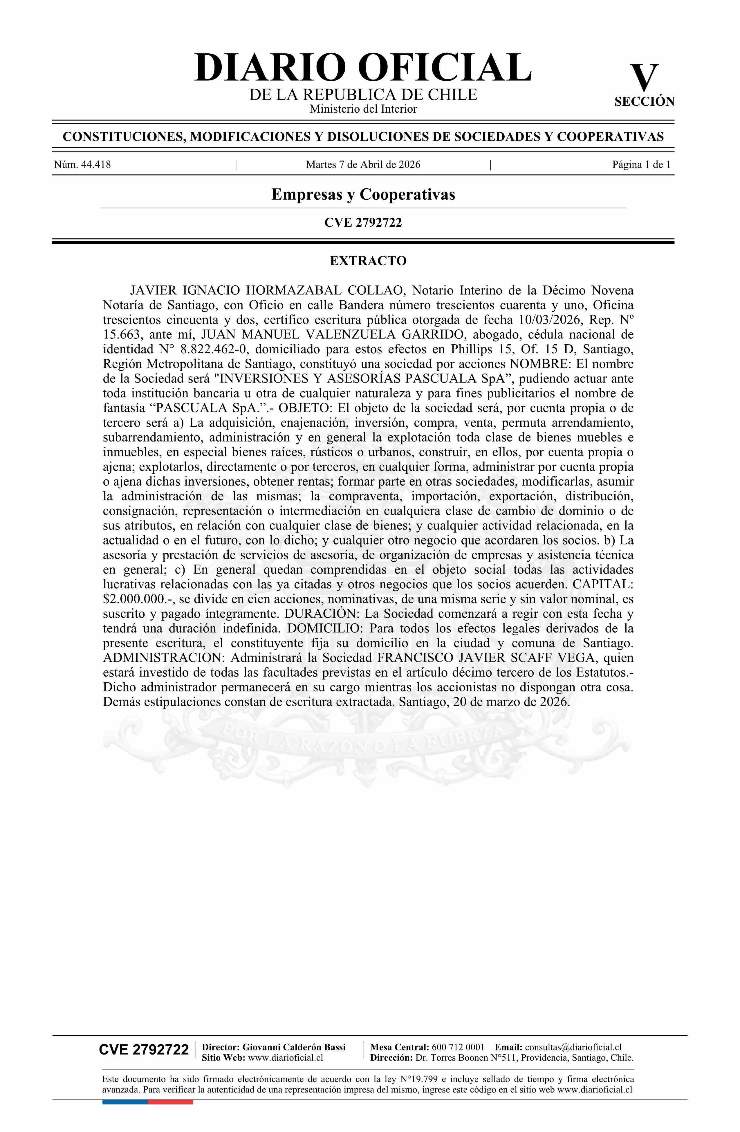 INVERSIONES Y ASESORÍAS PASCUALA SpA