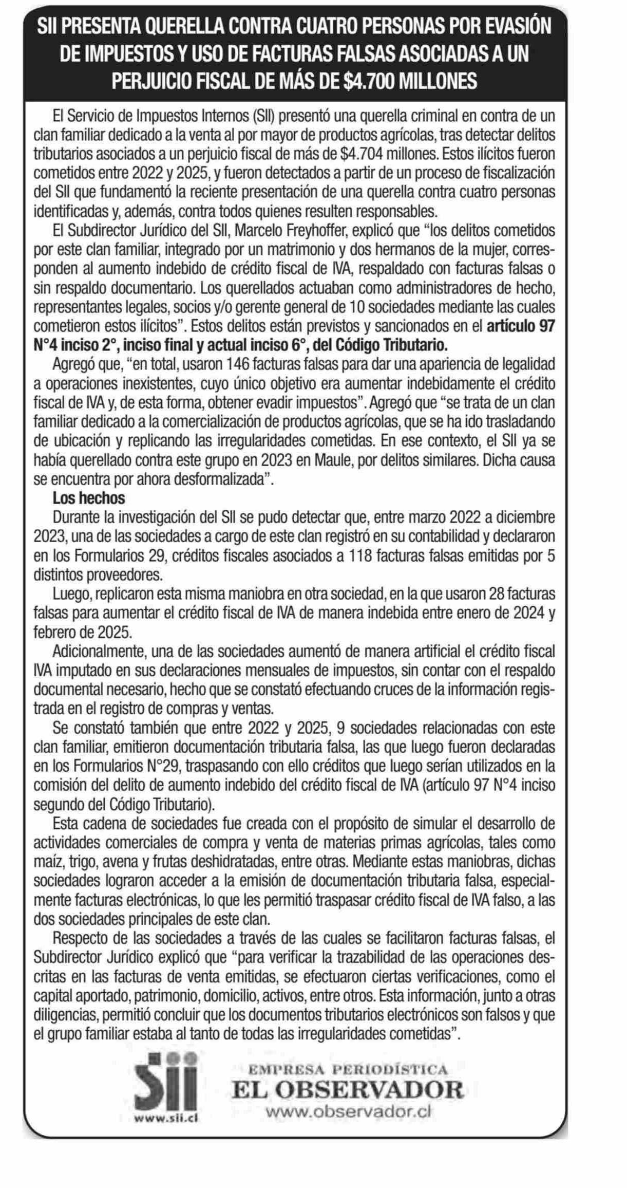 | Título: | EXTRACTOS: SIl PRESENTA QUERELLA CONTRA CUATRO PERSONAS POR EVASIÓN DE IMPUESTOS Y USO DE FACTURAS FALSAS ASOCIADAS A UN PERJUICIO FISCAL DE MÁS DE $4.700 MILLONES |