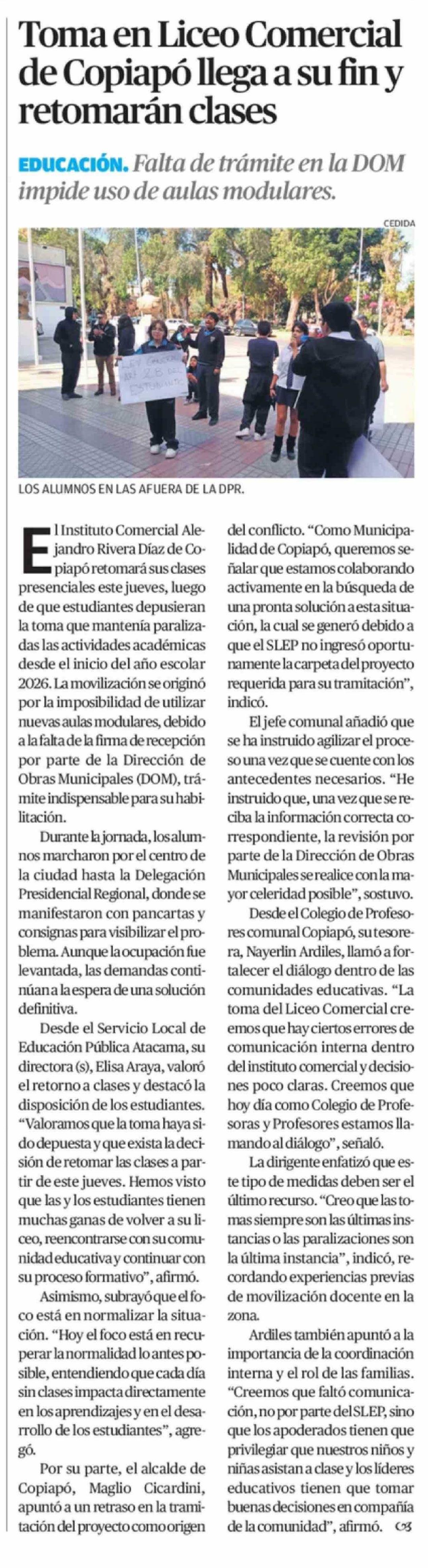 Toma en Liceo Comercial de Copiapó llega a su fin y retomarán clases