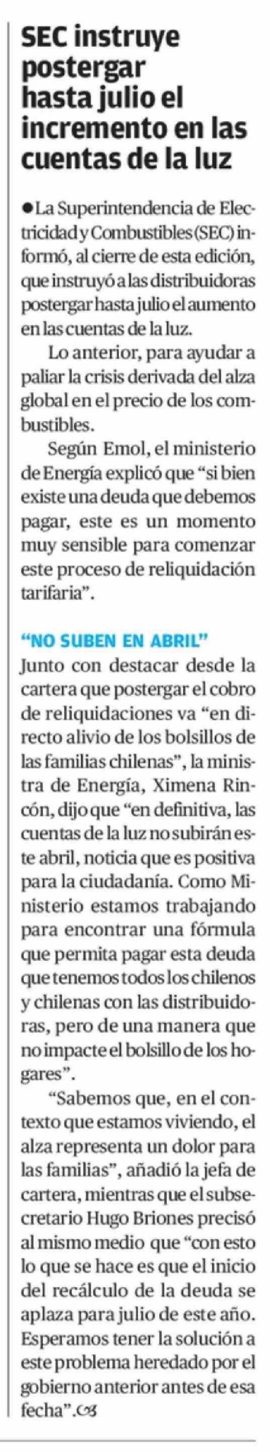 SEC instruye postergar hasta julio el incremento en las cuentas de la luz
