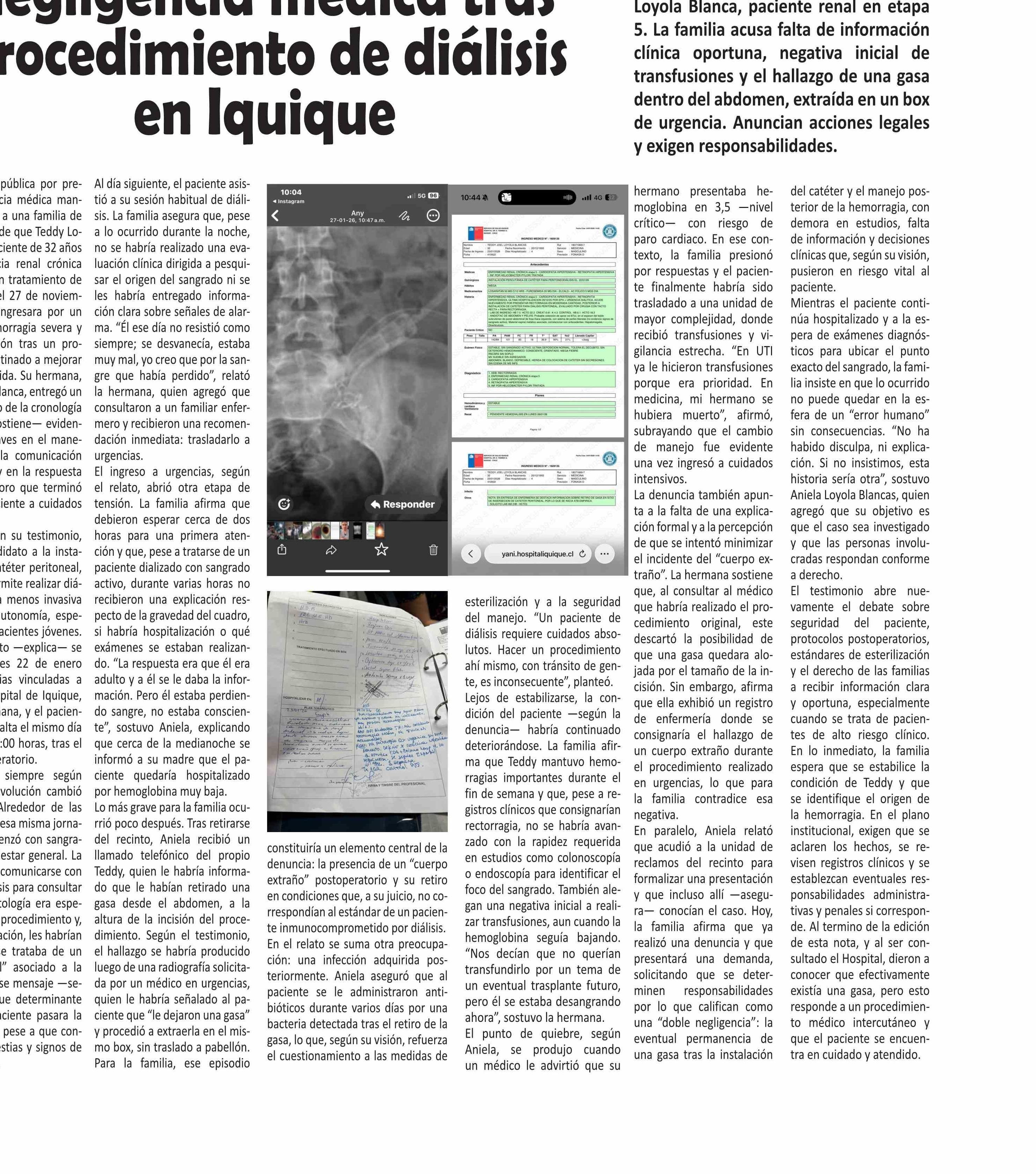 Familia denuncia presunta negligencia médica tras procedimiento de diálisis en Iquique