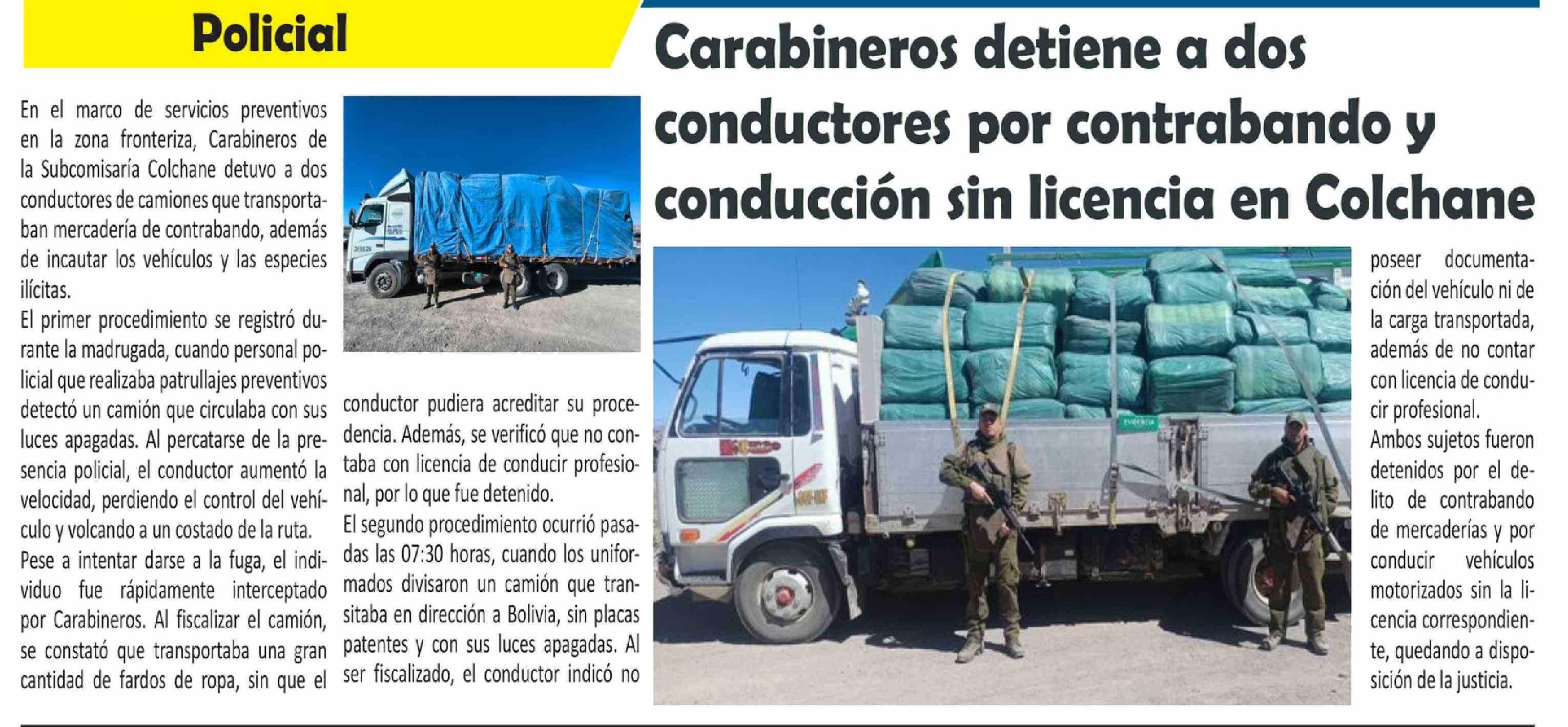 Carabineros detiene a dos conductores por contrabando y conducción sin licencia en Colchane