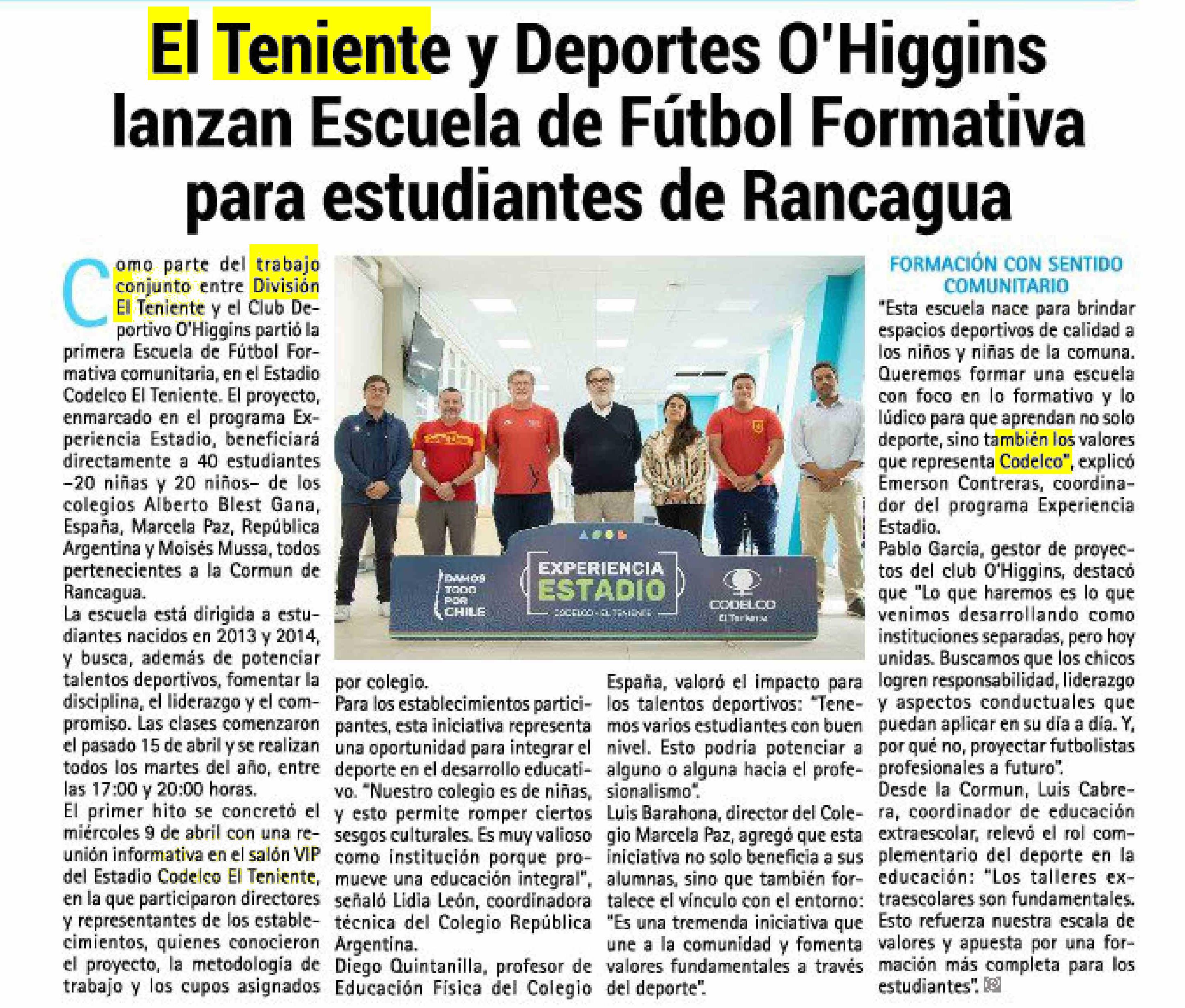 El Teniente y Deportes O'Higgins lanzan Escuela de Fútbol Formativa para estudiantes de Rancagua